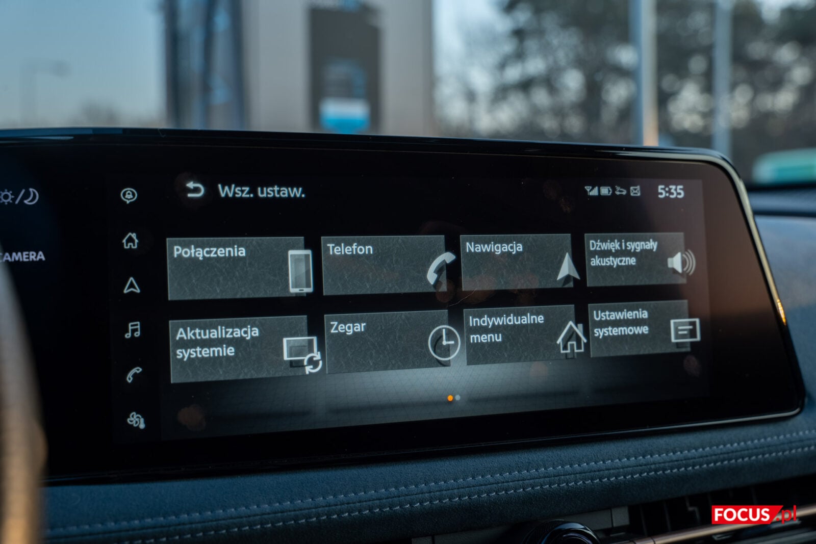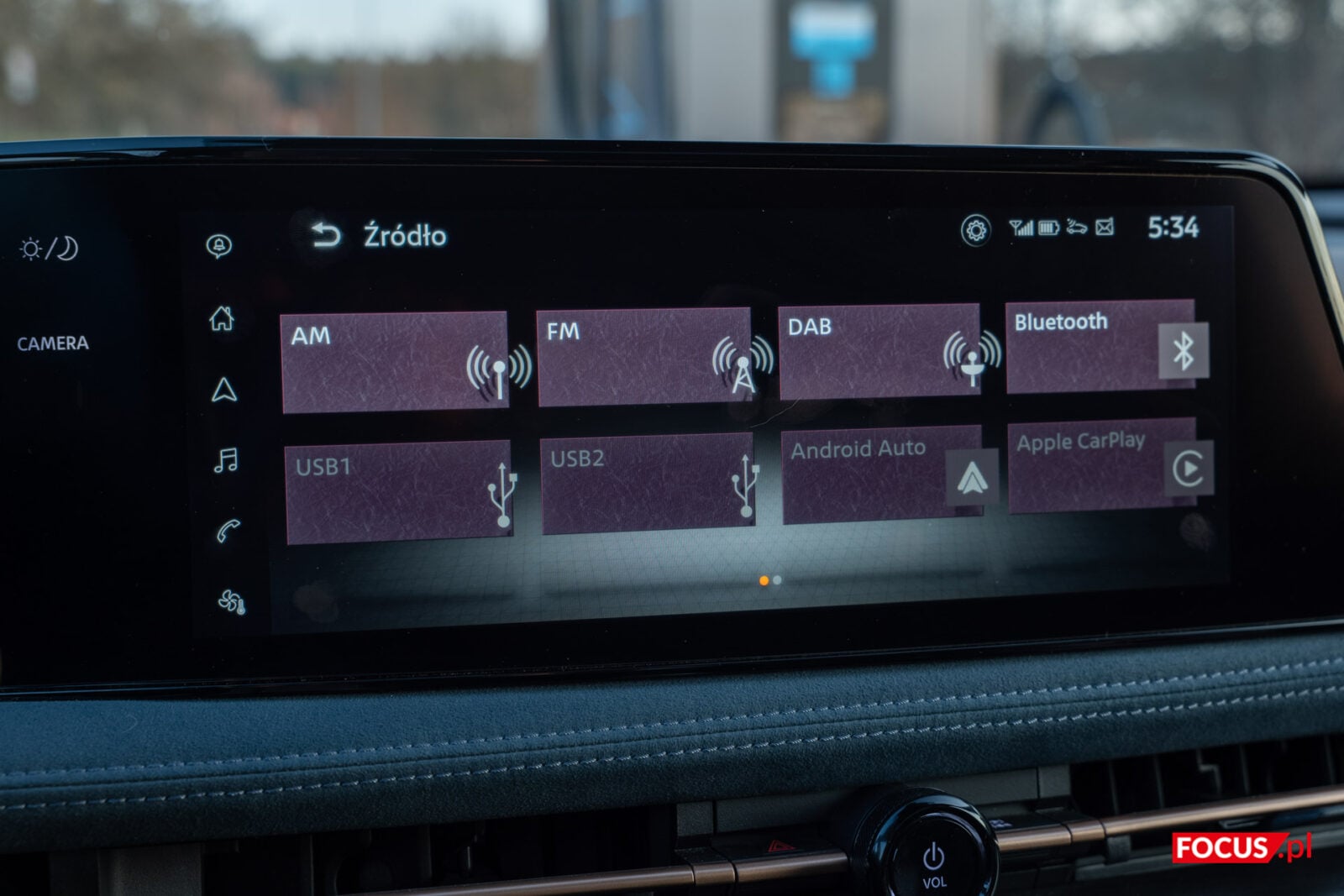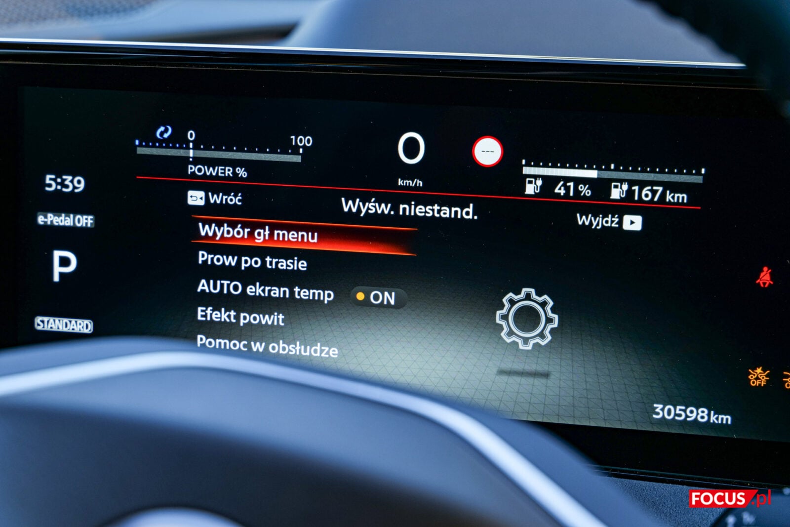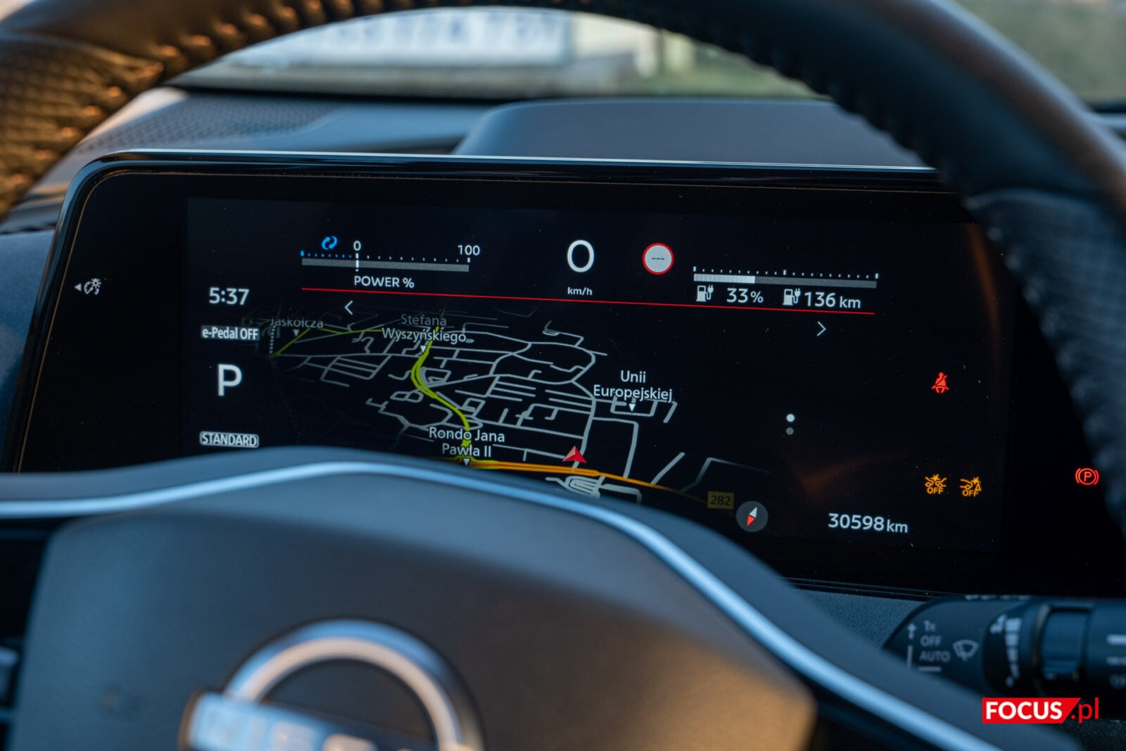 Nissan trzyma się pewnej filozofii projektowania swoich samochodów. Ekrany przy kierowcy są do zarządzania jazdą i ewentualnego przełączenia muzyki lub odebrania połączenia, a ekran w centrum przeznaczono do zarządzania multimediami i połączeniami. Pomiędzy tymi dwoma panelami znajduje się mały panel dotykowy, który pozwala włączyć obraz z kamer, niezbędny do parkowania ze względu na przeciętną widoczność z tylnego lusterka, a także przełączać się między trybem jasnym i ciemnym. Szkoda, że na większym ekranie nie zmienimy ustawień związanych z jazdą, bo mogłoby to sporo ułatwić.