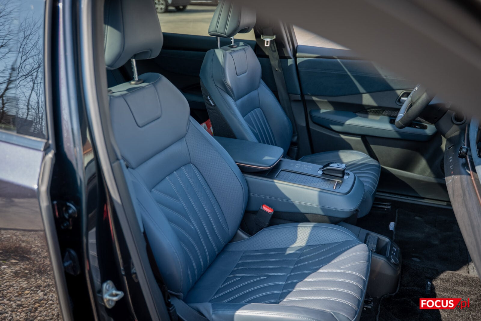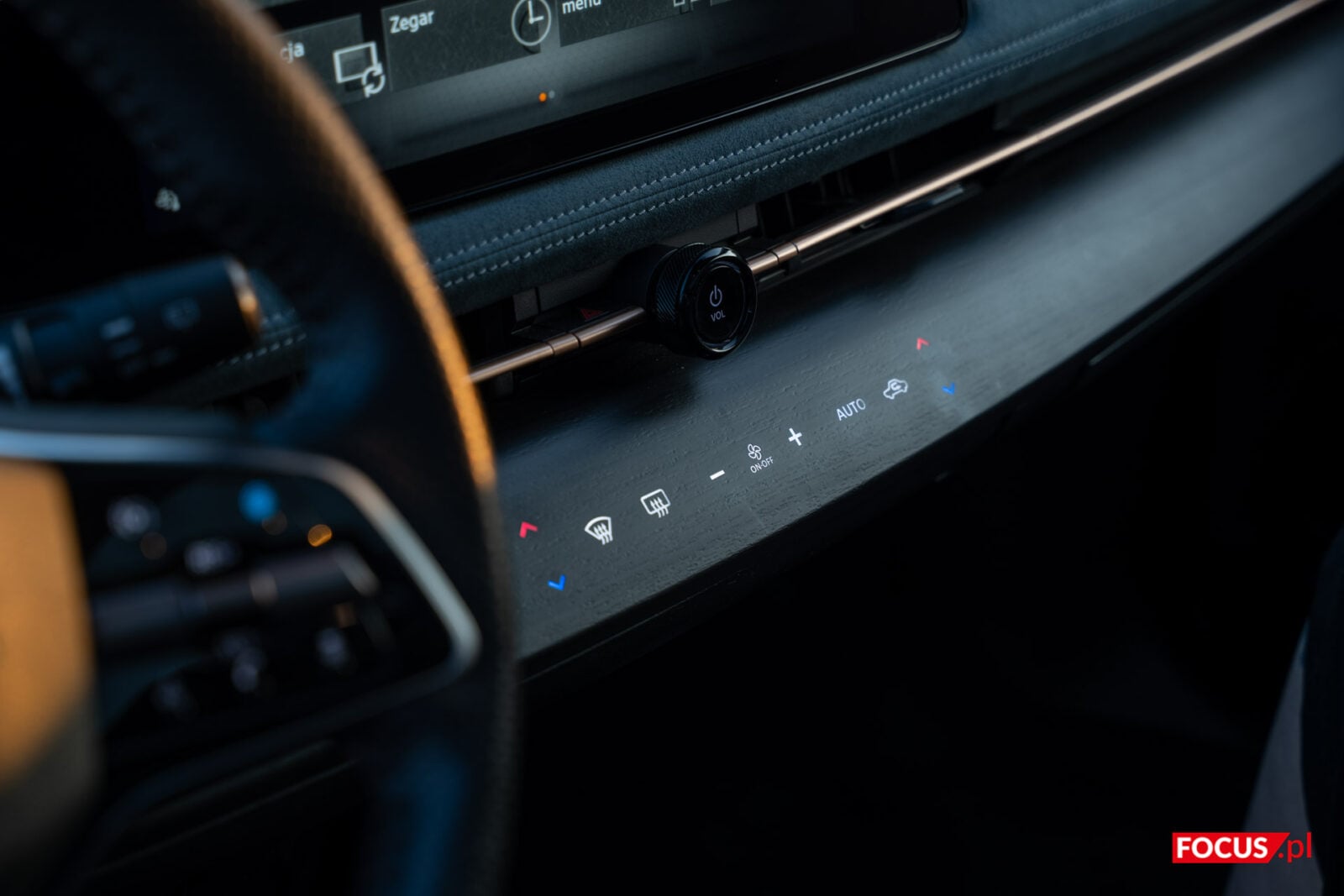 Trudno wybrać jeden element pojazdu, który zwraca szczególną uwagę. Mnie na początku urzekł panel rozciągający się na całą długość obudowy. Wygląda niczym drewno, choć na jego powierzchni zmieszczono przyciski… tyle, że to nie przyciski. To płytki dotykowe wsparte haptycznymi wibracjami. Rzadko kiedy w smartfonach wibracje są na tak wysokim poziomie, a co dopiero w samochodach. Jeśli implementować rozwiązania dotykowe, to tak jak w Nissanie Ariya. Ten panel posłuży do regulowania klimatyzacji – temperatury na poszczególnych stronach oraz miejsc, gdzie kierujemy nawiew. Jednocześnie włącznik systemu multimediów i regulacja głośności są wmontowane w osobne pokrętło umieszczone powyżej.