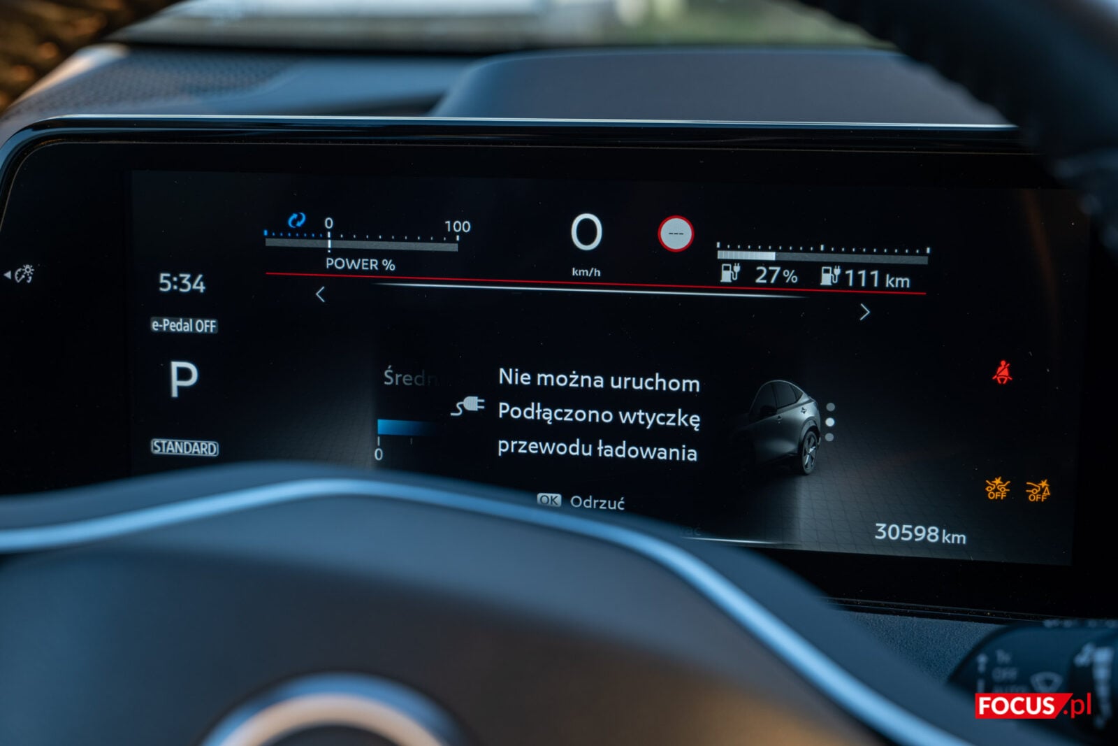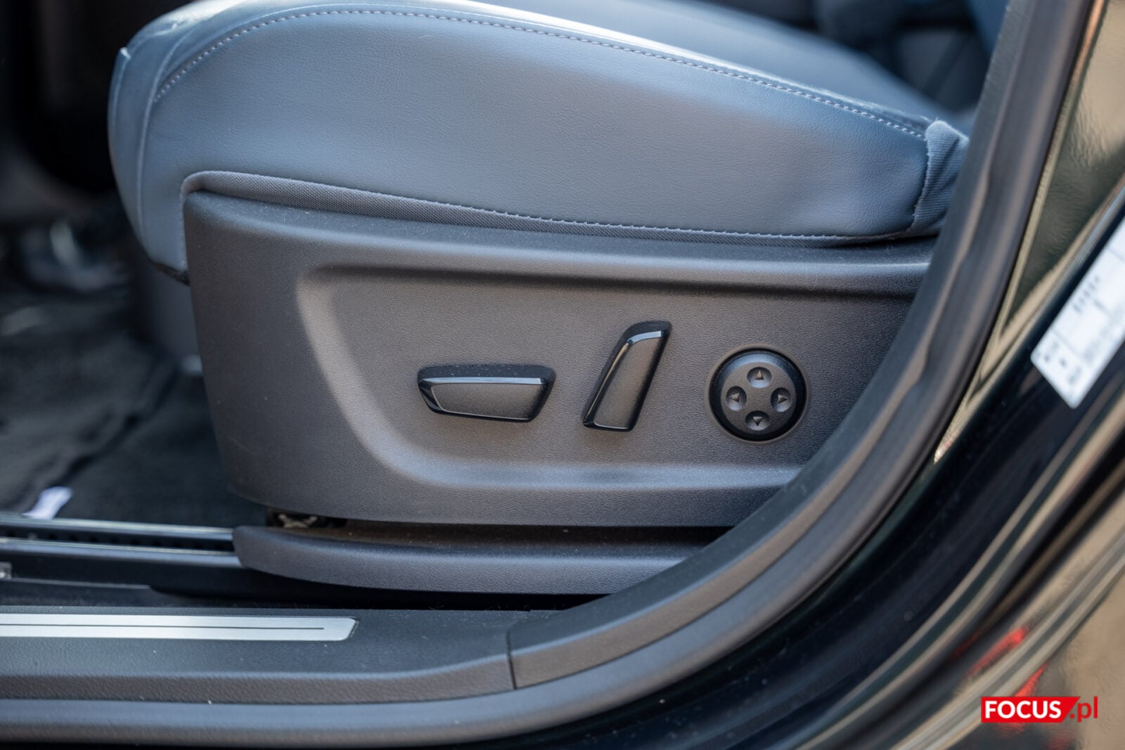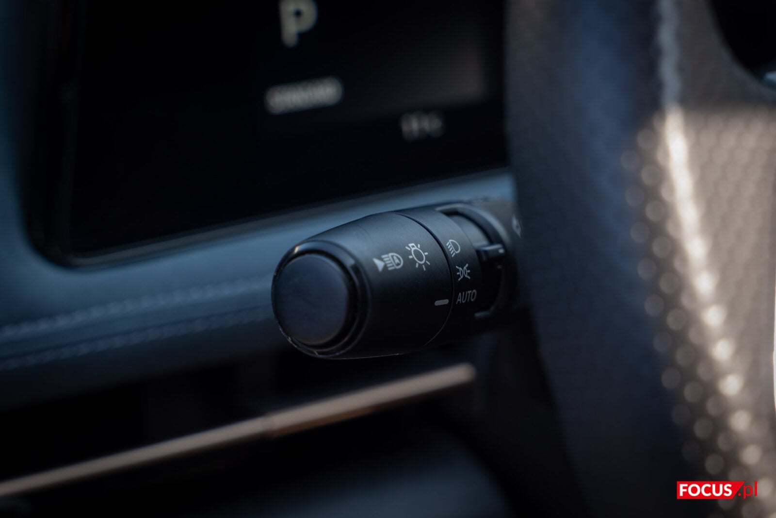 Dość standardowo prezentują się przyciski do zarządzania otwarciem szyb, pozycją lusterek oraz zamknięciem auta umieszczone na podłokietniku przy drzwiach. Podobnie rzecz ma się z kierownicą, z poziomu której możemy ustalić asysty prowadzenia, a także wyregulować muzykę czy odebrać połączenie. Nieco zaskakuje, że pokrętło po lewej stronie nie pozwala regulować głośności, ale ma ważniejsze zadanie – przełączanie się między ustawieniami.