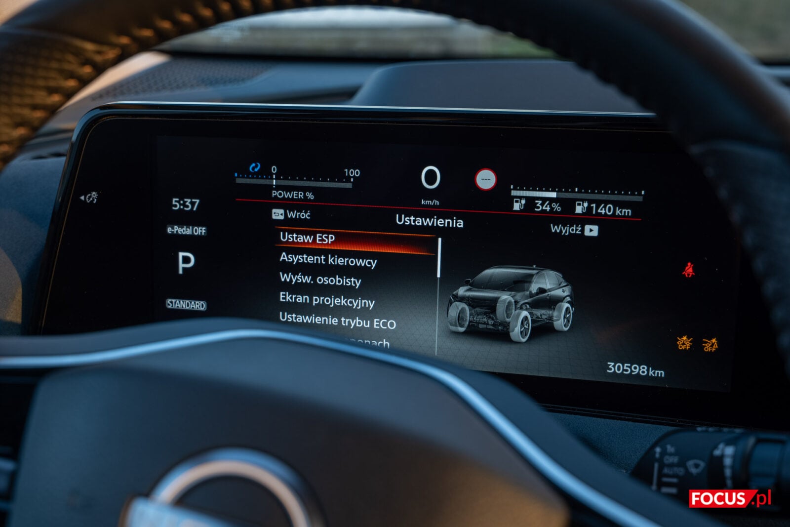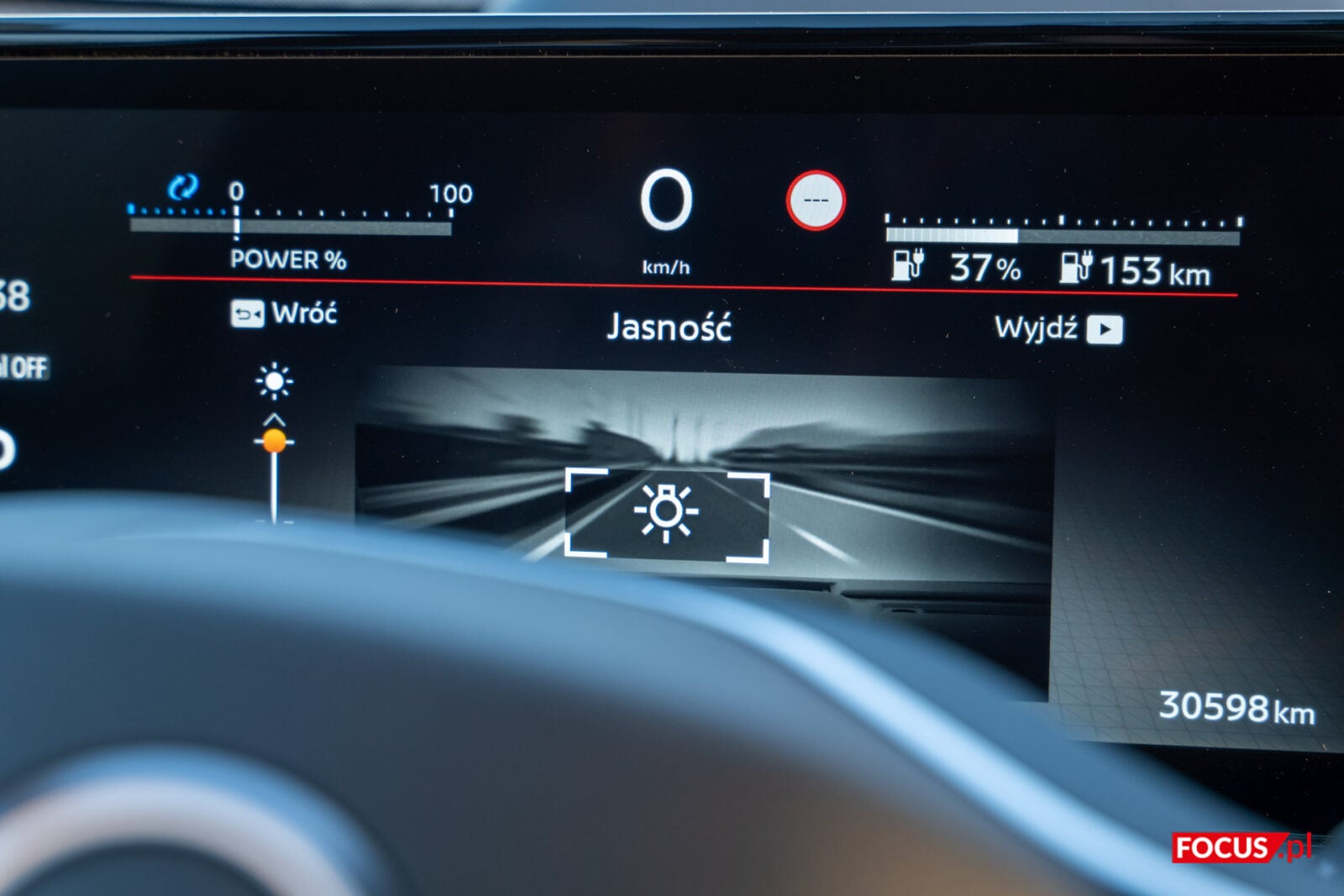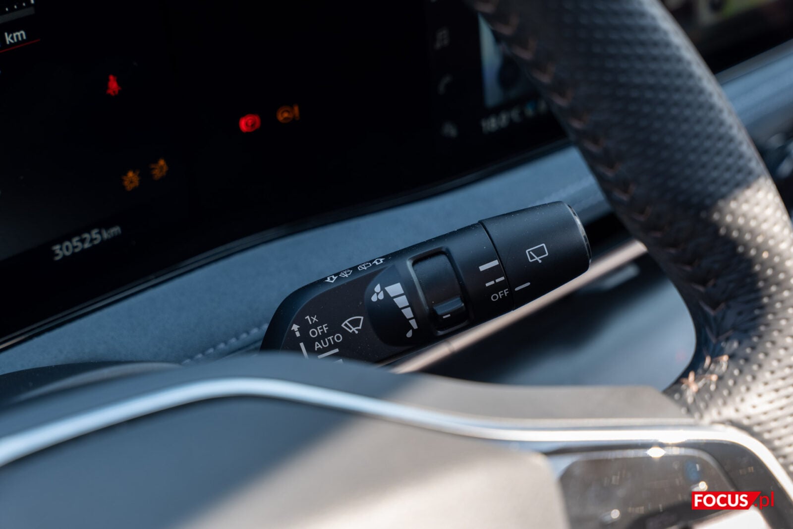 Dość standardowo prezentują się przyciski do zarządzania otwarciem szyb, pozycją lusterek oraz zamknięciem auta umieszczone na podłokietniku przy drzwiach. Podobnie rzecz ma się z kierownicą, z poziomu której możemy ustalić asysty prowadzenia, a także wyregulować muzykę czy odebrać połączenie. Nieco zaskakuje, że pokrętło po lewej stronie nie pozwala regulować głośności, ale ma ważniejsze zadanie – przełączanie się między ustawieniami.