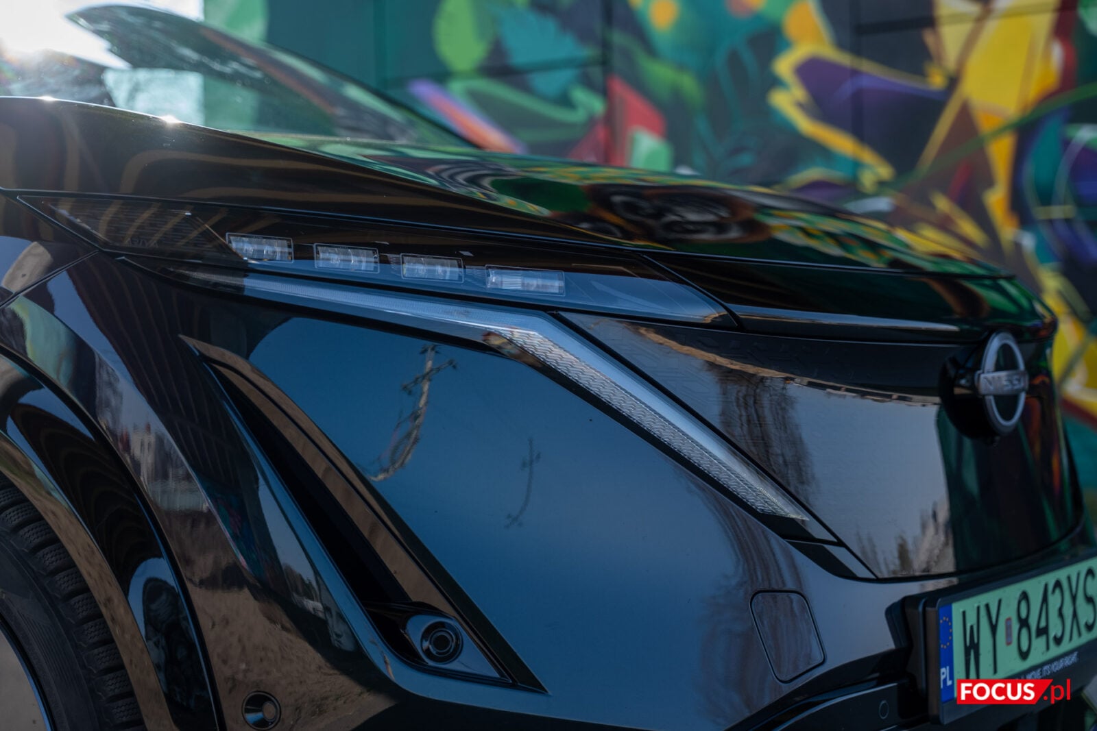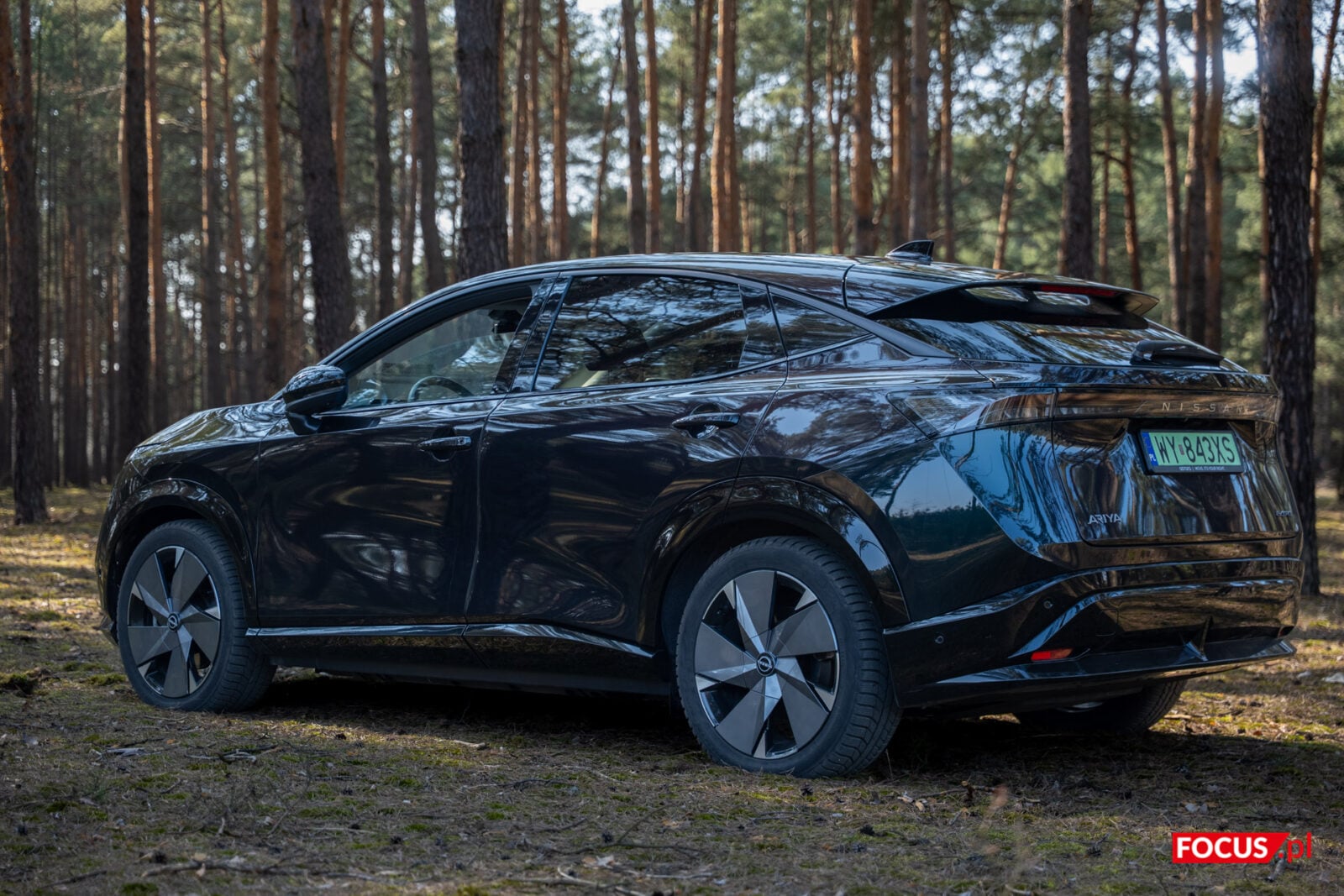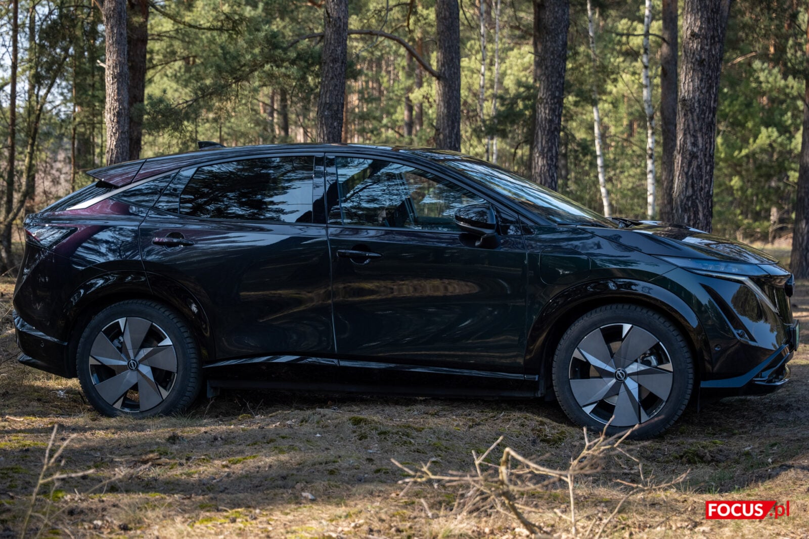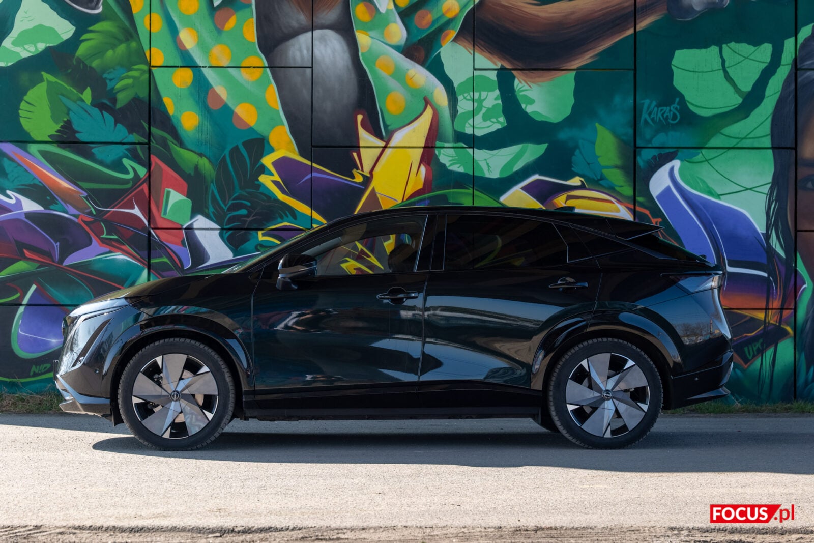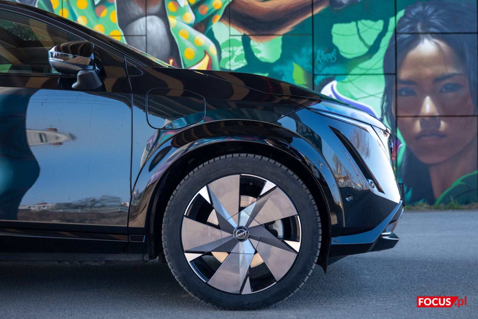 Nissan Ariya to crossover o dużych gabarytach, w których wyrzeźbiono dynamiczną i odważną sylwetkę. Charakter tych ostrych linii nieco umyka szybkiemu rzutowi oka w czarnym lakierze. W tej wersji samochód nieraz potrafi być bardziej zielony, by przy mocniejszym promieniu słońca zza jego brokatowego lakieru wyzierał lekko śliwkowy kolor. Jednocześnie na co dzień tej wersji najbliżej do klasycznej czerni. W połączeniu z 20-calowymi felgami stworzonymi specjalnie dla edycji Evolve otrzymujemy wygląd dojrzałego i poważnego samochodu.
