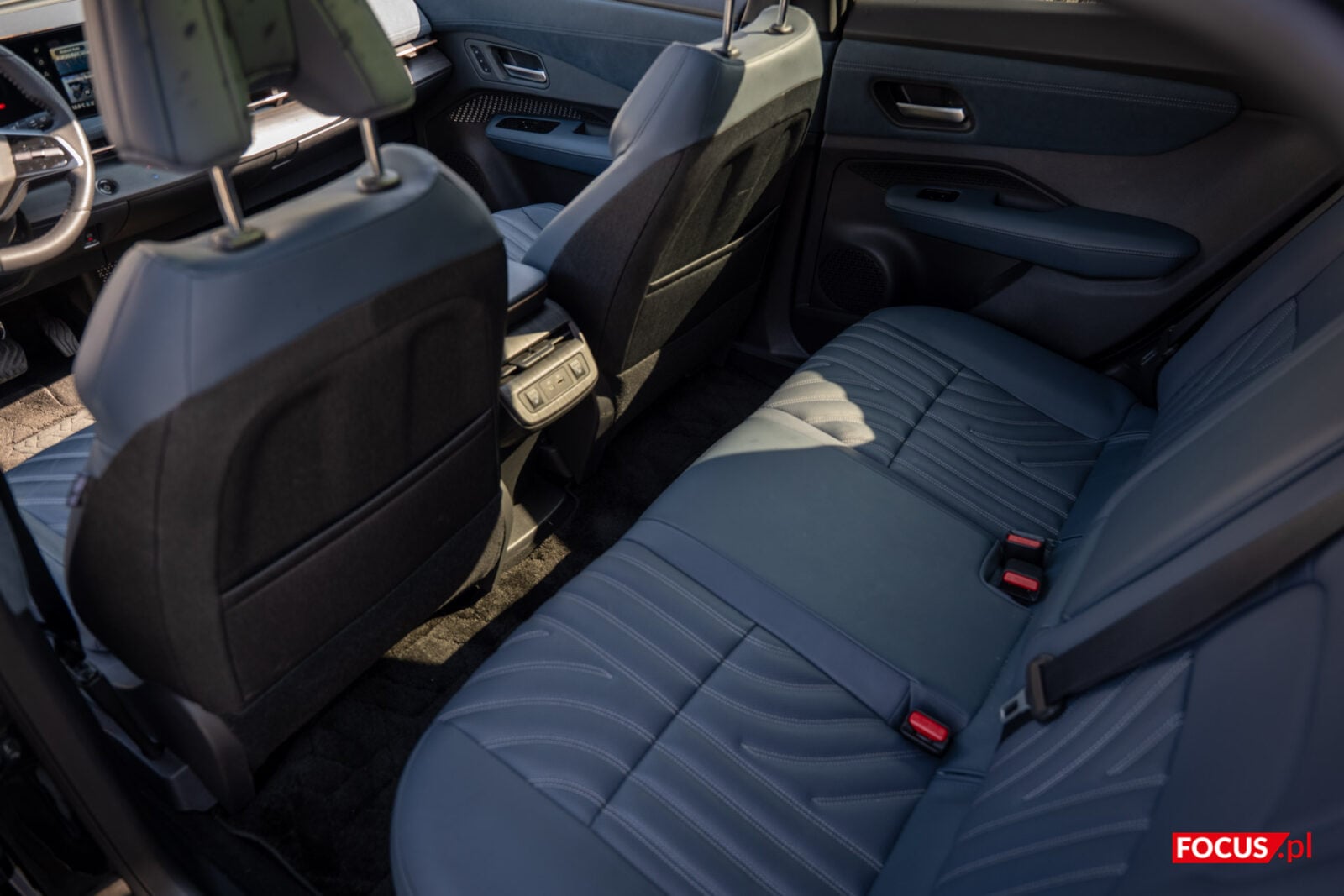 Jeśli chcecie dać im miejsce z tyłu, nie musicie się o brak tego miejsca martwić. Nissan Ariya to naprawdę przestronny wóz – na tyle, bym ze wzrostem 190 cm zmieścił się z tyłu zarówno za mniej wysuniętym fotelem pasażera, jak i za kierowcą. Wszystko dzięki dobrze wpasowanej kanapie o lekkim nachyleniu, dzięki czemu grzywką nie zahaczałem o dach. Miejsca z tyłu było tyle, by bez problemu chować rzeczy w kieszeni na tyle przedniego fotela.