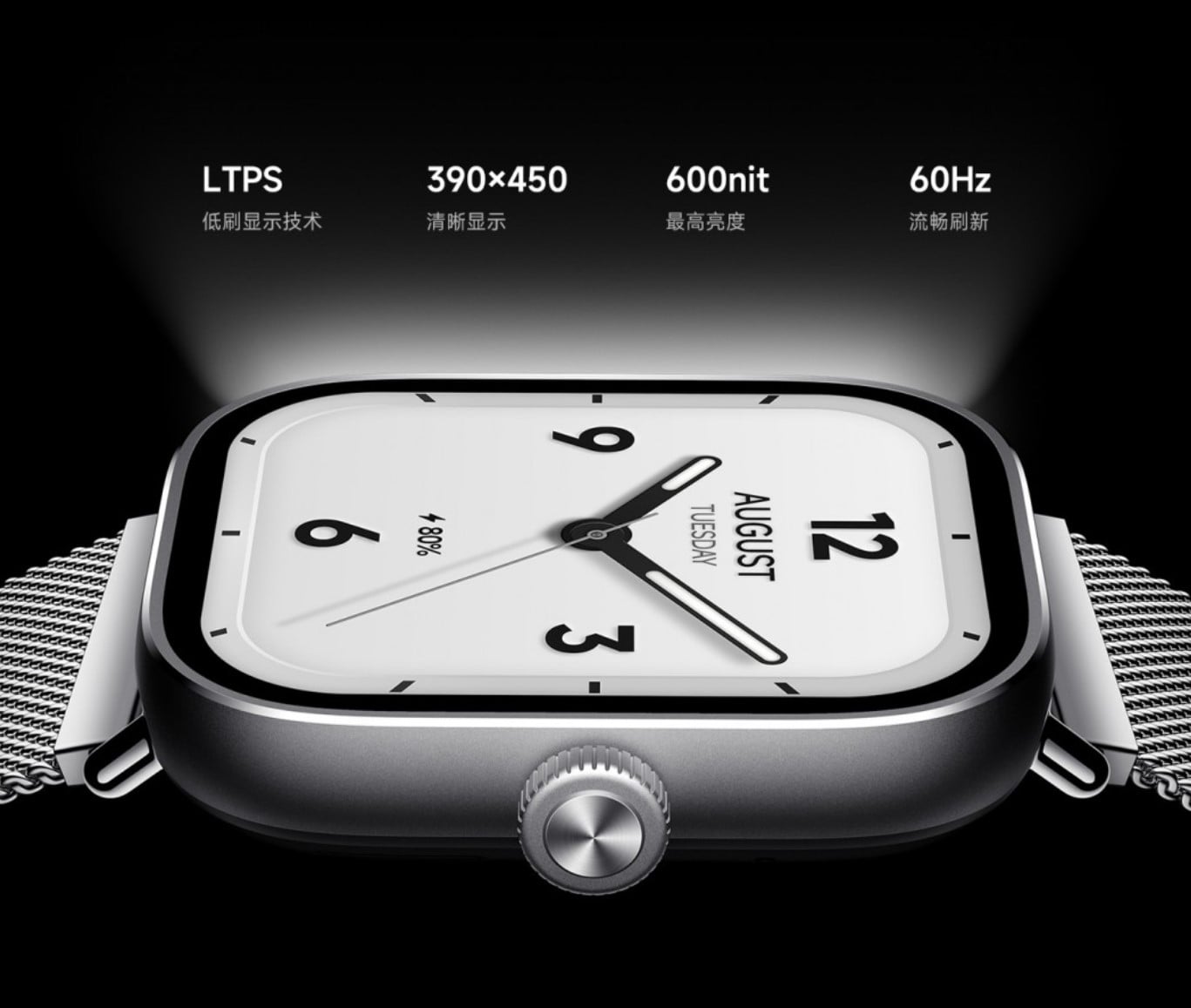 Zegarek wyposażono w kwadratową tarczę otoczoną obudową ze stopu aluminium. Jest to pierwszy smartwatch marki z metalową obudową typu unibody. W oczy od razu rzuca się obrotowa koronka ze stali nierdzewnej, której u poprzednika nie było. Xiaomi zadbało, by Redmi Watch 4 był odporny na wodę – do głębokości 50 metrów oraz na pył czy warunki atmosferyczne zgodnie z certyfikatem IP68. Oferowany przez producenta wyświetlacz jest całkiem spory, bo dostajemy 1,97-calowy panel AMOLED. Ma on rozdzielczość 390 x 450 pikseli, odświeżanie 60 Hz i oferuje również szczytową jasność na poziomie 600 nitów, dzięki czemu nadaje się do użytku na zewnątrz i w ostrym świetle słonecznym. Znajdziemy tu również technologię LTPS, która pomaga wydłużyć czas pracy baterii.
