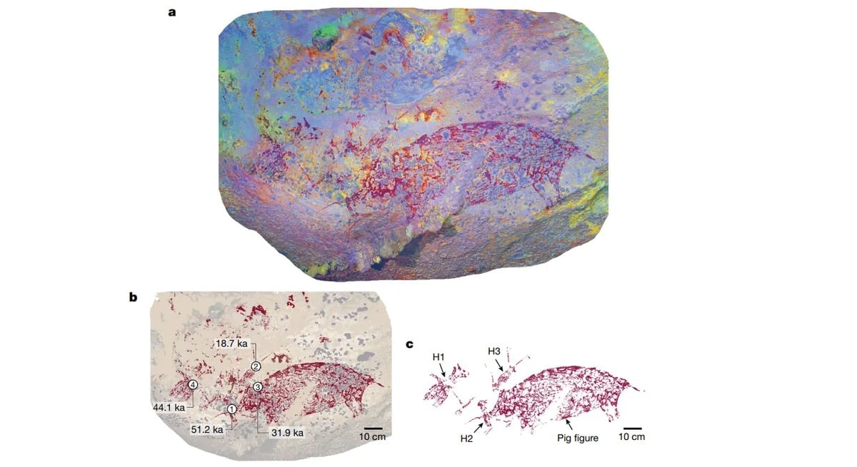 Rysunek naskalny znaleziony na wyspie Celebes w Indonezji ma około 51 200 lat. Jego autor przedstawił trzy ludzkie postacie oraz dzikie zwierzę, na które prawdopodobnie polowano