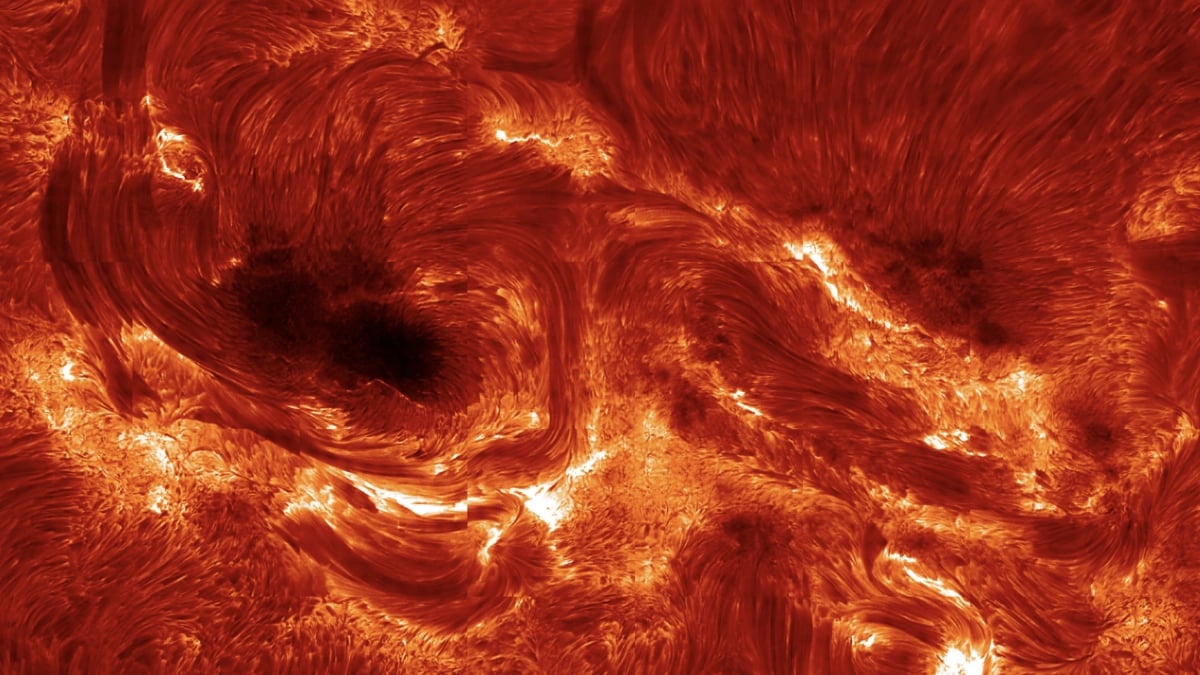 To, co widać na tych zdjęciach, zachwyca nie tylko estetycznie. W penumbrze plam, czyli w jaśniejszym, „piórkowym” otoczeniu ciemnego jądra, cienkie włókna gazu układają się zwykle mniej więcej promieniście. Tym razem naukowcy zobaczyli włókna mocno powyginane, poskręcane i poprzecinane, jakby ktoś zaplótł z nich warkocz. Taki obraz to klasyczny sygnał, że pole magnetyczne w tym miejscu jest bardzo napięte i zestresowane.