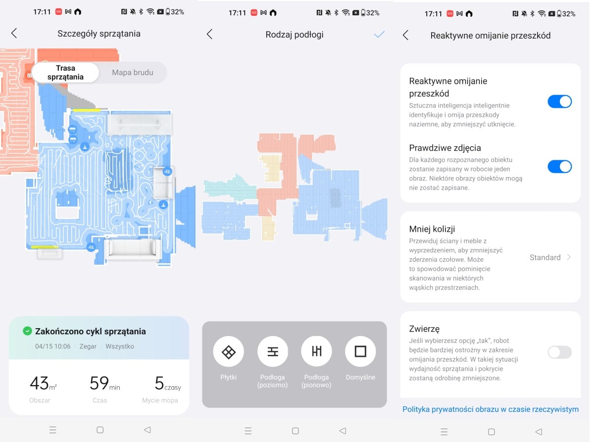 To przydaje się też w trakcie sprzątania. Przy wsparciu sztucznej inteligencji (Reactive AI 2.0) rozpoznaje przeszkody na swojej drodze, ale też niektóre meble. Co możecie zobaczyć na zrzutach ekranu pokazującej mapę mieszkania. Są na niej zaznaczone meble oraz przeszkody, takie jak np. przewody czy listwy zasilające z kablami.
