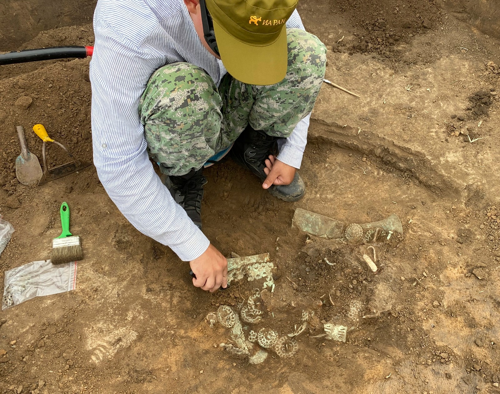 Cały depozyt znajdował się w okrągłej, niezbyt głębokiej jamie, oddalonej o 15-25 metrów od głównego kurhanu. To, co wydobyto na światło dzienne, tworzyło niemal kompletny zestaw przedmiotów związanych z końmi i ich uprzężą. Wśród żelaznych wędzideł, klamer popręgowych oraz psałów wykonanych z rogu, brązu i żelaza, prawdziwą uwagę przykuwają ozdoby. Archeolodzy wydobyli 30 ażurowych blaszek oraz 12 płaskich, okrągłych z wypustem, zdobionych misternymi motywami swastyk, ptaków i hybrydowych zwierząt. Do tego dochodzi ponad 500 drobnych brązowych pierścieni, które najpewniej obszywały rzemienie. Szczególnie interesujące są tak zwane licziny, czyli brązowe blaszki z wyobrażeniami masek, pełniące funkcję rozdzielaczy w uprzęży. Obok nich leżały szczęki dzika, fragmenty ceramicznego naczynia oraz drewniana czarka ze srebrnymi okładzinami, zdobionymi w charakterystycznym, zwierzęcym stylu nomadów.