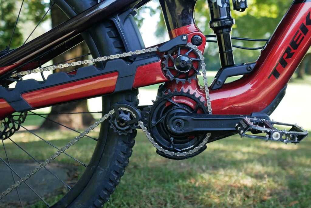 Nawet ci, którzy nie wiedzą wiele o rowerach, szybko zauważą, że łańcuch w Trek Slash+ działa w dość dziwny sposób. Jest tu zawieszenie typu high-pivot. Wysoki punkt obrotu jest korzystny w zjeździe i lepiej reaguje na pokonywane przeszkody, bo wahacz “ucieka” do góry i do tyłu, a nie “siłuje się” z przeszkodami.