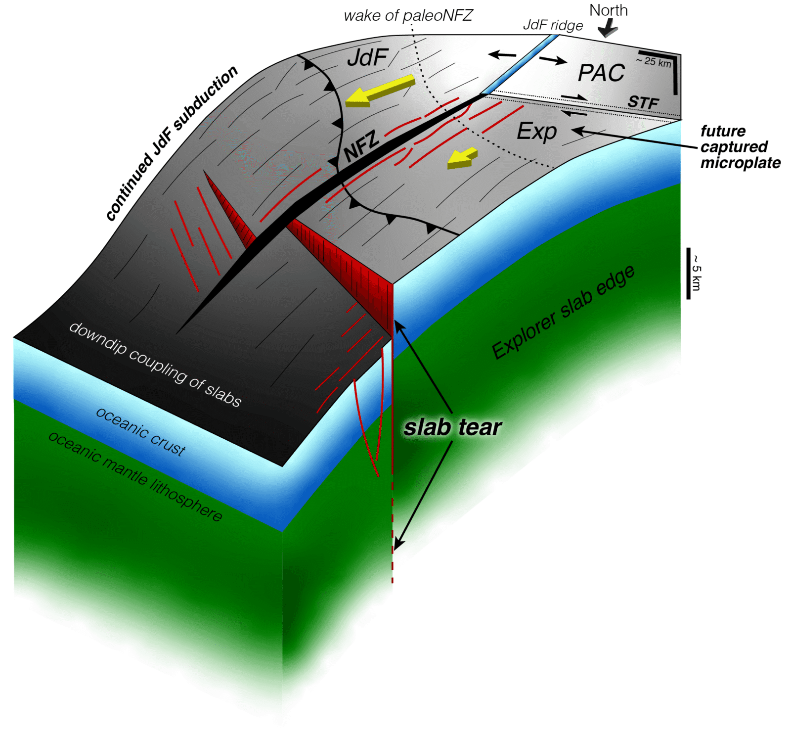 Kluczową rolę w tym procesie odgrywa Strefa Uskoku Nootka (NFZ), która działa jak naturalne nożyce przecinające płytę prostopadle do kierunku rozrywania. Ten transformacyjny uskok powstał ok. 4 milionów lat temu i stopniowo przekształcił się w dojrzałą granicę, która oddzieliła mikropłytę Explorer od jej większej sąsiadki. Współczesne pomiary geodezyjne pokazują wyraźną różnicę w tempie konwergencji – płyta Explorer przemieszcza się z prędkością zaledwie ok. 2 cm rocznie, podczas gdy sąsiednia płyta Juan de Fuca wciąż nurkuje z prędkością przekraczającą 4 cm rocznie. Ta dysproporcja stanowi mocny dowód na postępujące odsprzęganie się Explorera.