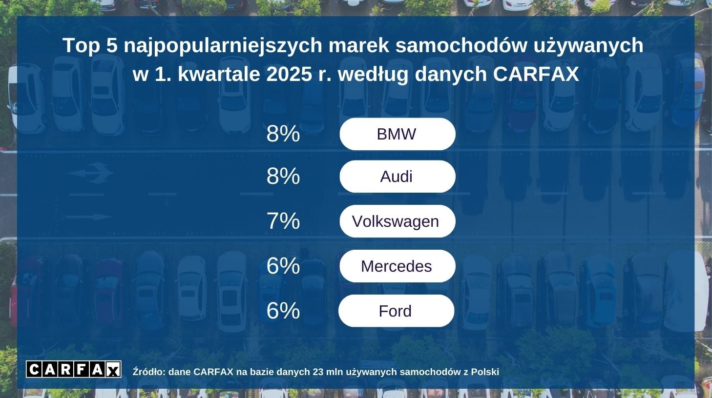 Pod względem popularności wśród używanych aut w pierwszym kwartale 2025 roku na czele stawki znalazły się marki premium: BMW i Audi (obie po 8% udziału). BMW charakteryzuje się średnim wiekiem 12 lat i przebiegiem 177 tys. km, natomiast Audi – 11 lat i 186 tys. km. Za nimi plasują się Volkswagen (7%, 12 lat, 186 tys. km), Mercedes (6%, 13 lat, 170 tys. km) oraz Ford (6%, 10 lat, 159 tys. km).