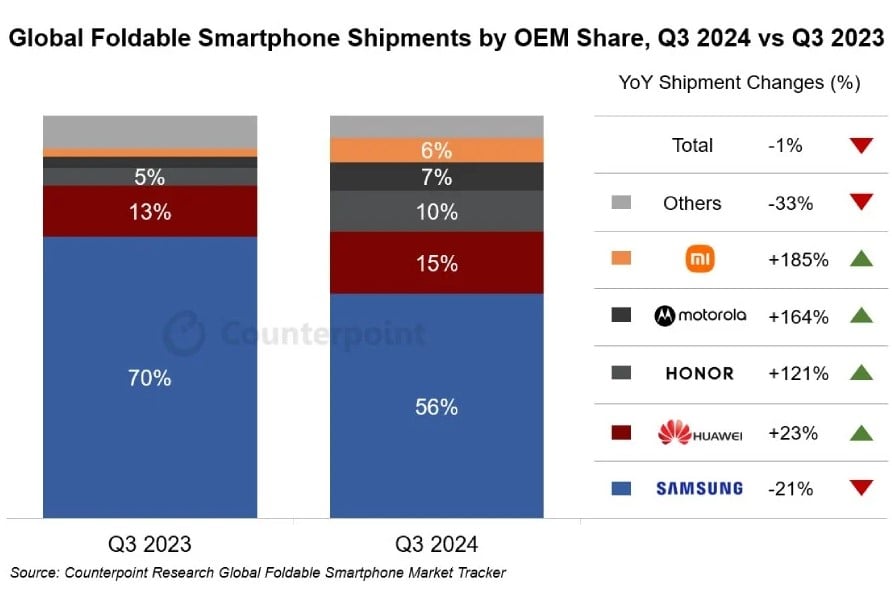 Południowokoreański gigant od lat nazywany jest królem składaków, jednak już od dłuższego czasu jego pozycja światowego lidera staje się coraz bardziej niepewna. Nie chodzi w zasadzie o to, że konkurencja depcze mu po piętach, a o fakt, że kiedy inne firmy zaliczają ciągłe wzrosty, Samsung wciąż traci. Dobrze pokazuje nam to najnowszy raport firmy badawczej Counterpoint Research za III kwartał tego roku. Mimo iż cały rynek zanotował spadek o 1% w porównaniu z analogicznym okresem z ubiegłego roku, to większość kluczowych producentów składaków może świętować nie lada sukces.