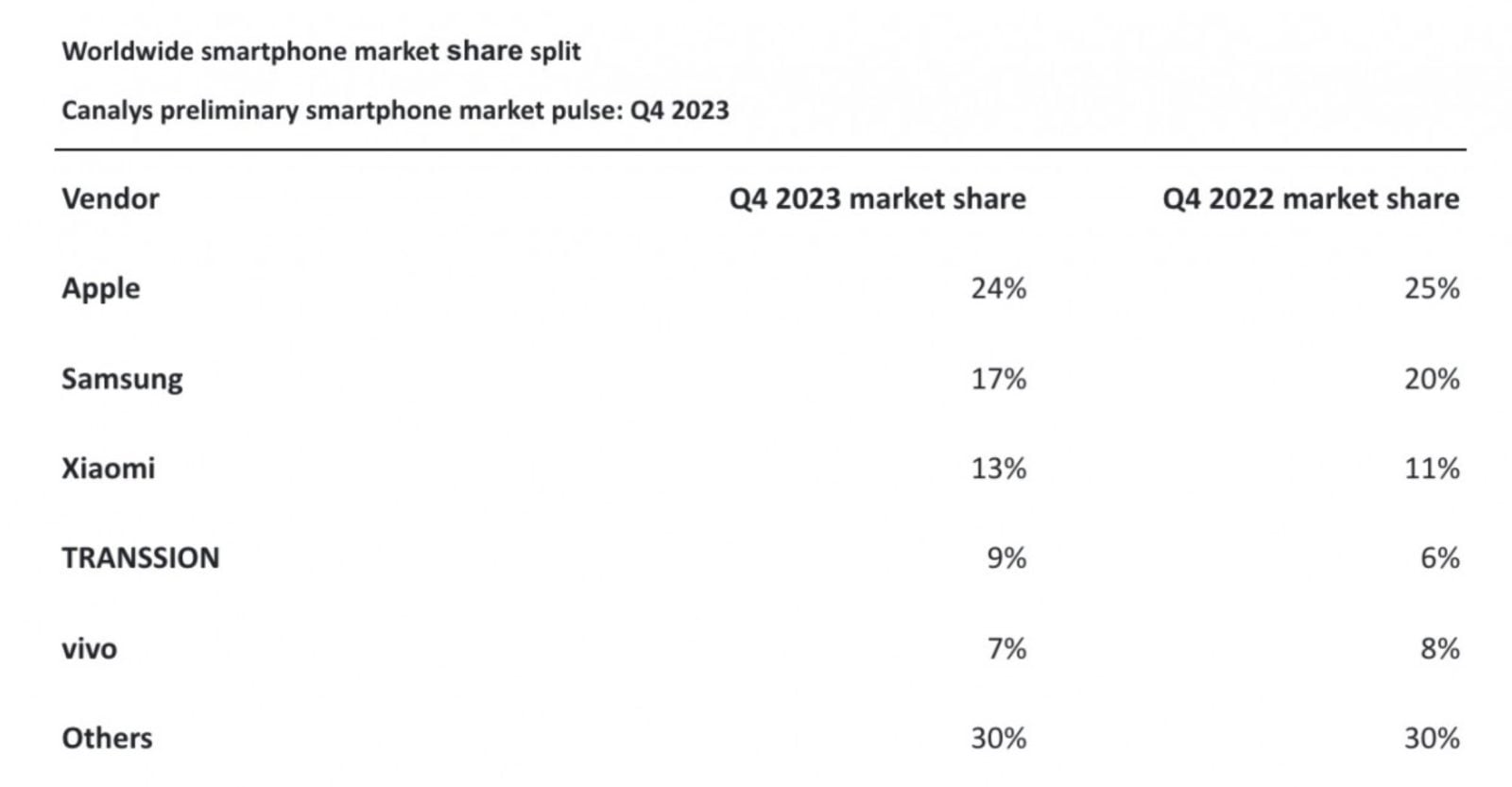 Na rynku smartfonów od dawna mamy duopol – rządzi Samsung i Apple. Obaj giganci wymieniają się na pierwszych miejscach zestawień, a najczęściej ma to miejsce w kwartałach, w których wprowadzali na rynek swoje nowe produkty. Tak też jest i tym razem. Co prawda iPhone’y 15 debiutowały jeszcze we wrześniu, ale tak naprawdę szczyt sprzedaży osiągnęły w ostatnich trzech miesiącach roku. Dzięki temu Apple mógł wyprzedzić swojego głównego konkurenta i zająć pierwsze miejsce z 24% udziałem w rynku. Różnica między wynikiem obu firm nie jest jednak marginalna, bo Samsung zakończył ten kwartał z 17% udziałem, choć wydaje się, że dzięki nadchodzącej premierze Galaxy S24 z pewnością sobie to odbije.