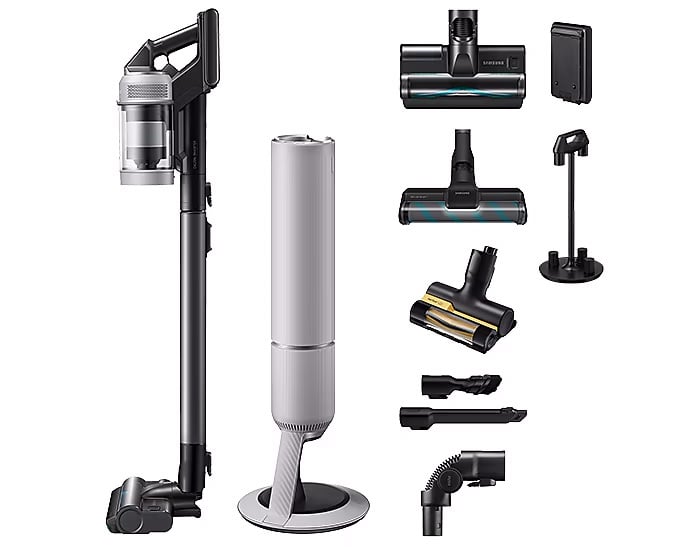 Jak przystało na model z serii Bespoke, ten odkurzacz także został wyposażony w stację ładującą z systemem automatycznego opróżniania pojemnika na kurz. Po odstawieniu urządzenia na stację cały brud zebrany w pojemniku zostanie wyssany do worka znajdującego się w stacji dokującej. Nie trzeba więc opróżniać go ręcznie i zawsze jest gotowy do pracy.