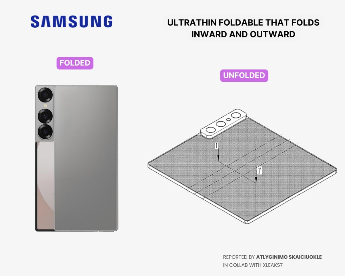 Grafiki patentowe, udostępnione przez informatora @xleaks7 i zauważone przez GSMArena, prezentują pojedynczy, elastyczny wyświetlacz, który składa się w obie strony, eliminując potrzebę stosowania dodatkowego ekranu zewnętrznego. Obecne składane modele są ograniczone do jednej formy składania, głównie do środka, choć mamy na rynku kilka modeli składanych na zewnątrz. Mimo tego klasyczny Fold, do pełni funkcjonalności potrzebuje zewnętrznego wyświetlacza. W tym jednak wypadku dodatkowy panel nie jest potrzebny, bo wystarczy złożyć urządzenie w drugą stronę.