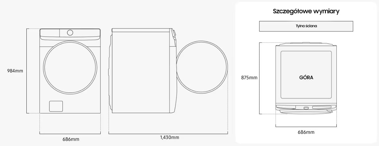 Pralka Samsung WF20DG8650BVU4 ma 87,5 cm głębokości, 68,6 cm szerokości i 98,4 cm wysokości. Urządzenie waży 98 kg.