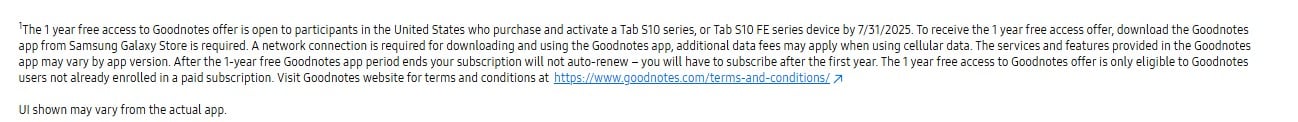 Samsung US oferuje roczny dostęp do Goodnotes za darmo dla serii Galaxy Tab S10, ale też Galaxy Tab S10 FE. By otrzymać taki prezent, należy „zakupić i aktywować serię Tab S10 lub urządzenie z serii Tab S10 FE do 31 lipca 2025 r.”. Oprócz potwierdzenia premiery takiego modelu, można z tego zapisu wysnuć wniosek, że urządzenie zadebiutuje przed końcem lipca 2025 roku, choć to nie daje nam wskazówki co do dokładnej daty.