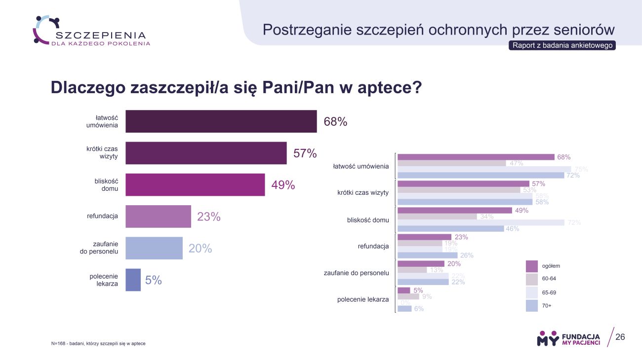 Seniorzy bardzo doceniają usługę szczepienną w aptece i taką deklarację złożyło aż 96 proc. naszych zaszczepionych badanych. A powody? Trzy najczęściej wskazywane to łatwość umówienia się (na to wskazuje 68 proc.), krótki czas wizyty i oraz bliskość punktu szczepień aptecznych od domu (49 proc.). Ważne dla nich jest także, że czynności związane ze szczepieniem mogą załatwić podczas jednej wizyty w aptece, w jednym czasie, co nie jest możliwe w placówce POZ. Natomiast jedna istotna uwaga: pytani o preferencje co do punktu szczepień, wciąż w większości (62 proc.) wymieniają placówkę POZ. To rekomendacja lekarza POZ przekonuje i zachęca ich do szczepień, pod wpływem tego profesjonalisty podejmują decyzję o szczepieniu.