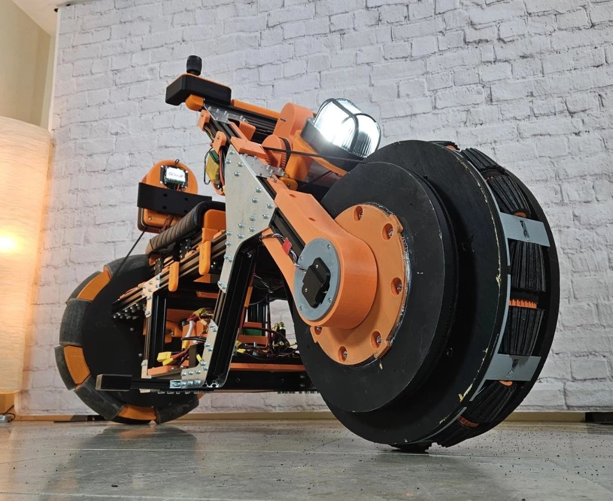Bruton znany jest z budowania nietypowych maszyn i eksperymentowania z robotyką. Sidewinder to jednak coś więcej niż kolejne “dziwadło” na kołach. Ten przypominający motocykl typu chopper pojazd opiera się na dwóch ogromnych, wielokierunkowych kołach, które pozwalają mu poruszać się w dowolnym kierunku bez obracania nadwozia. Jedno koło znajduje się z przodu, drugie z tyłu – oba pochodzą z wcześniejszych projektów konstruktora. Dzięki temu maszyna może przemieszczać się nie tylko przód–tył, ale też na boki i wokół własnej osi, zupełnie jak zaawansowany robot magazynowy czy… hoverboard.