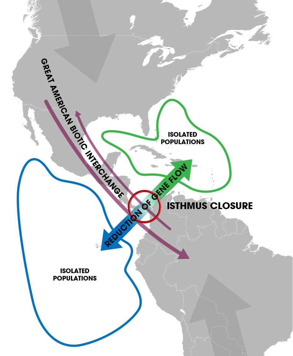 Wraz z uformowaniem się lądowego przesmyku doszło także do wielkiej wymiany fauny, która w rezultacie przyniosła nieodwracalne zmiany w ekosystemach. Z Ameryki Południowej przywędrowały na tereny Meksyku i USA leniwce, pancerniki i oposy. Natomiast na południe udały się tapiry, konie i niedźwiedzie. Podobną migrację odbywały także nietoperze z rodziny liścionosowatych (Phyllostomidae).