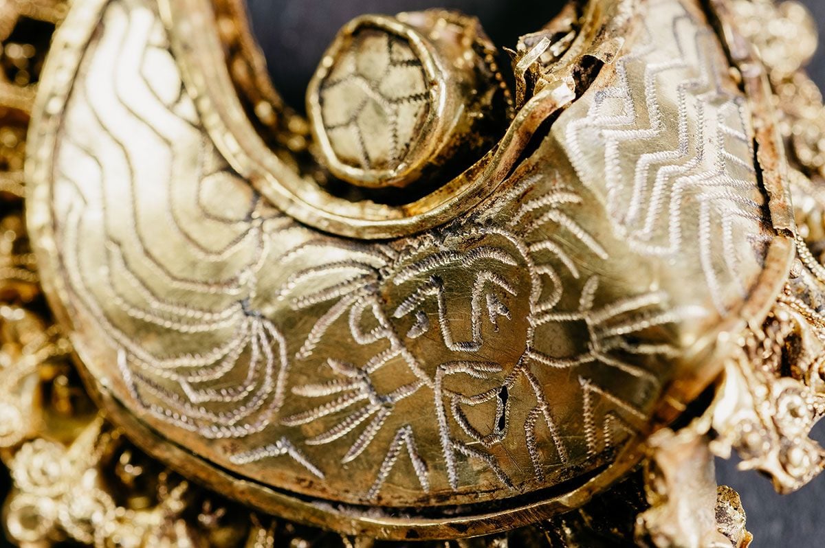 Dwa pasujące do siebie paski złotego listka były kiedyś mocowane do krawędzi lub paska ubrania. Jeden wisiorek jest mocno uszkodzony, prawdopodobnie przez uprawę ziemi, w której przedmioty leżały przez wieki. Inny wisiorek zawiera grawerunek głowy mężczyzny z promieniami wokół niej. To portret Chrystusa, znanego jako Sol Invictus – “niezwyciężone Słońce”. Podobne złote zawieszki do uszu znaleziono wcześniej w Holandii tylko trzy razy.