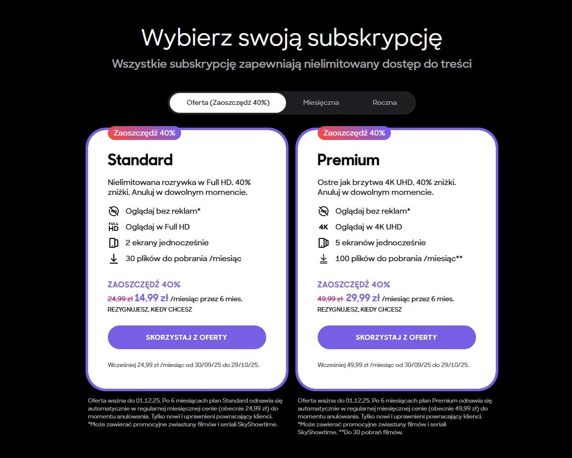 Oferta skierowana jest do nowych użytkowników oraz do określonej grupy powracających abonentów. Platforma nie precyzuje dokładnie, kto kwalifikuje się do tej drugiej kategorii, więc byłym użytkownikom pozostaje sprawdzenie dostępności promocji w swoim koncie. Warto zwrócić uwagę, że najtańszy wariant Standard z reklamami za 19,99 złotych miesięcznie nie został objęty promocją. Ten pakiet pozwala na oglądanie tylko na jednym urządzeniu i zawiera przerwy reklamowe.