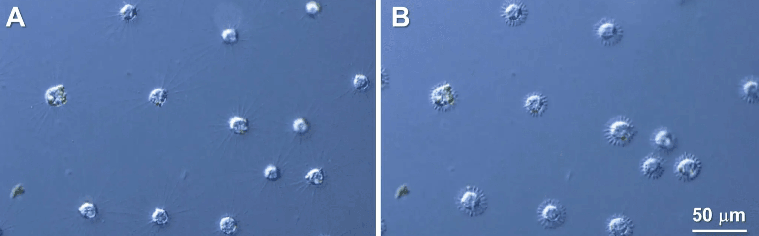 Naukowcy przyjrzeli się białku zwanemu tubuliną i obserwowali jego ruch przed i po skurczeniu się nibynóżek. Odkryli, że początkowo były one ułożone systematycznie na całej długości, ale po wycofaniu szybko gromadziły się na powierzchni komórki. To oznacza, że podczas gwałtownego chowania, mikrotubule natychmiast rozpadały się na tubulinę. Zaskakujące było to, że degradacja mikrotubul zachodzi tak szybko, gdyż zwykle jest zjawiskiem powolnym. Jak to możliwe?