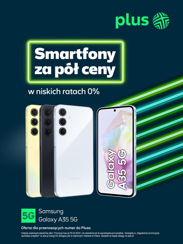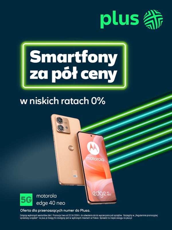 Jak sama nazwa wskazuje, w ramach tej promocji Plus przecenia wybrane modele smartfonów o 50% przy opcji ratalnej 0%. Do wyboru mamy smartfony marki Samsung, Motorola i Xiaomi, a rabat może sięgnąć prawie 1000 złotych, co daje dużą oszczędność. Oferta jest skierowana do klientów indywidualnych i przedsiębiorców, którzy przeniosą numer do Plusa lub Plusha.