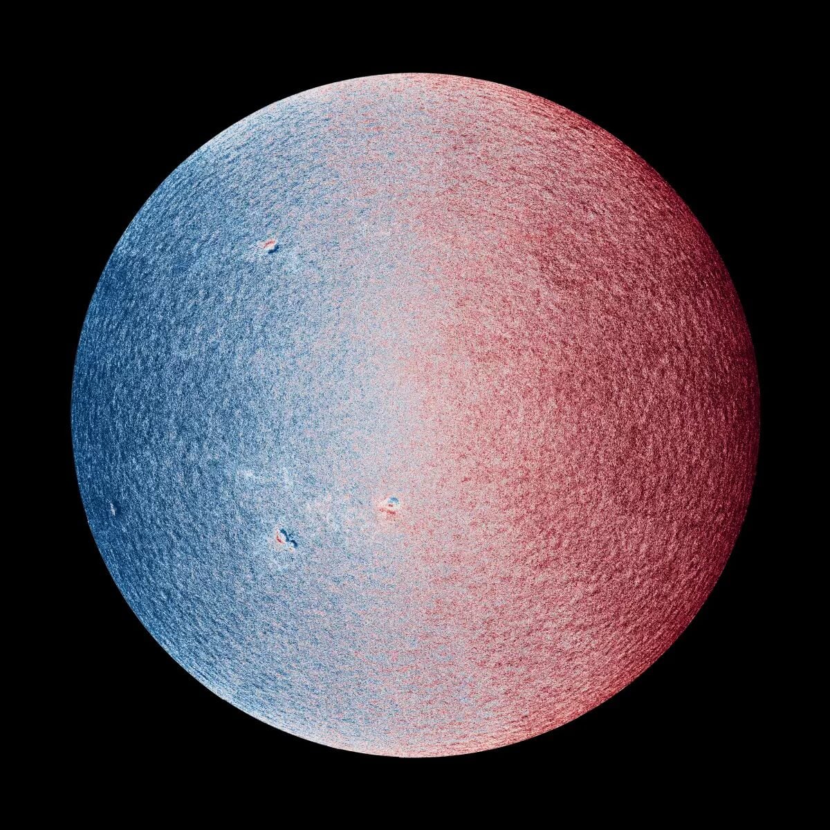 Poniższe nietypowe zdjęcie to tachogram, czyli reprezentacja prędkości i kierunku, w jakim porusza się materia na Słońcu. Punkty na powierzchni oznaczone kolorem niebieskim zbliżają się w stronę sondy kosmicznej, natomiast te zaznaczone na czerwono się od niej oddalają. Oczywiście, źródłem tego ruchu jest rotacja gwiazda wokół własnej osi.