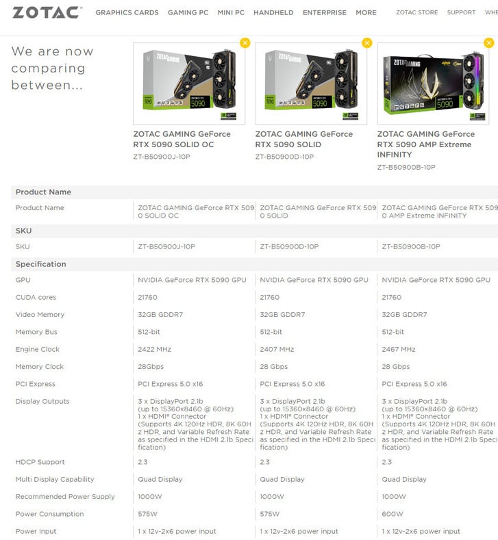 Jakiś czas temu firma ZOTAC zamieściła na swojej stronie internetowej listę nadchodzących kart graficznych. Pojawiły się tam dokładne specyfikacje dotyczą trzech wariantów RTX 5090 wersji SOLID, SOLID OC i AMP Extreme INFINITY, przy czym ten ostatni aktualnie zasłynął największym poborem mocy. Ze zrzutów ekranu wiemy, że nadchodzący flagowy model ZOTAC jest pierwszym przykładem karty graficznej NVIDIA skonfigurowanej z poborem mocy 600 W. Inne szczegóły, które ujawnia lista, obejmują 21 760 rdzeni CUDA i 32 GB pamięci GDDR7 z prędkością pamięci 28 Gb / s. Są to te same specyfikacje co u pozostałych wariantów karty, wyjątkiem może być nieco wyższa prędkość maksymalna zegara – 2 467 MHz.