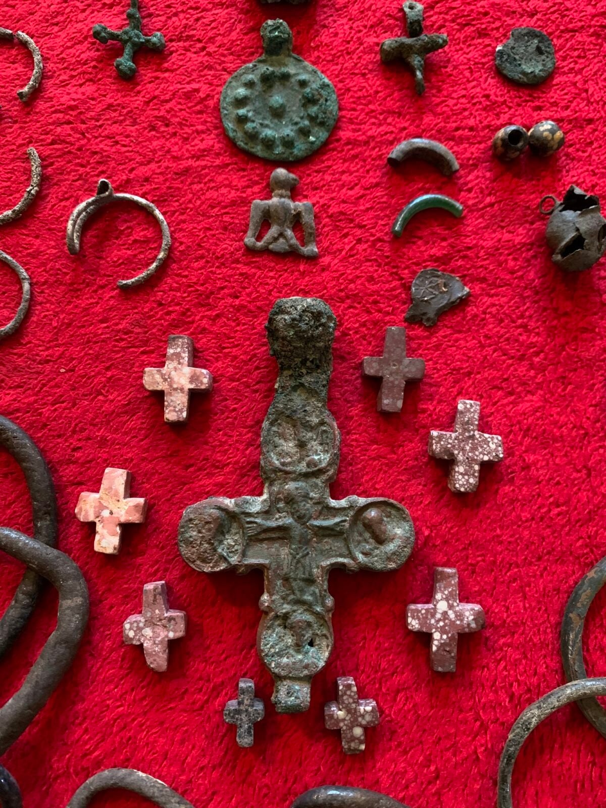 Choć bransolety stanowią główny liczbowo element skarbu, nie są jego jedyną wartością. Wśród znalezisk uwagę przykuwa masywny krzyż-enkolpion, czyli rodzaj noszonego na piersi relikwiarza, świadczący o statusie i pobożności. Odnaleziono także 17 innych krzyżyków: brązowych i marmurowych, 18 romboidalnych sprzączek oraz pięć srebrnych zausznic, charakterystycznych dla słowiańskiej kultury. Dla określenia profesji pierwotnego właściciela kluczowe są jednak inne artefakty. Ołowiana nakładka z motywem stylizowanego, trójzębnego sokoła, srebrny pierścień tarczowy czy brązowy kiścień to cenne znaleziska. Bezwzględnie potwierdza to jednak ołowiana plomba typu dorogoczyńskiego. Tego typu pieczęcie służyły do zabezpieczania towarów, a ich obecność w tym miejscu niemal jednoznacznie wskazuje, że mamy do czynienia z majętnym handlarzem. Dla archeologów jest to okazja do głębszych studiów. Szklane bransolety z okresu przedmongolskiego były popularne, ale w wykopaliskach przeważają ich fragmenty.