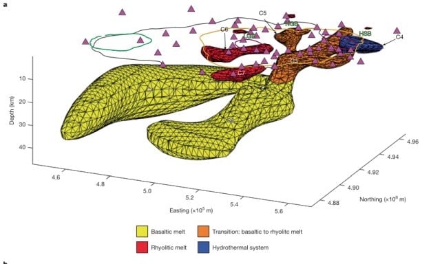 Ostatecznie autorzy doszli do wniosku, że pod powierzchnią istnieje co najmniej siedem odrębnych obszarów o wysokiej zawartości magmy. Są one zlokalizowane na głębokościach od 4 do 47 kilometrów, a zachodzący ruch wydaje się ustawiony w kierunku północno-wschodnim.