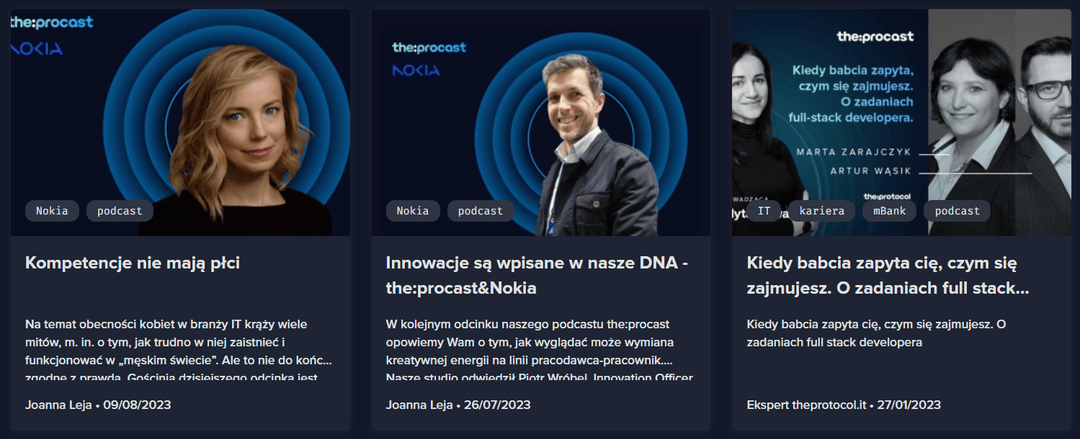 To już drugi sezon the:procast, prowadzonego od 2021 roku podcastu platformy the:protocol z ofertami pracy dla branży IT. Co ciekawe, tematyka poszczególnych odcinków nie ogranicza się wyłącznie do przekazywania dawki specjalistycznej wiedzy. Poruszany jest również szereg obszarów związanych m.in. ze zmianą stanowiska, poszukiwaniem nowego pracodawcy, planowaniem ścieżki kariery, aktualnymi trendami w rekrutacji, kształtowaniem środowiska pracy czy obszarem tzw. kompetencji miękkich. W końcu świat zaawansowanych technologii tworzą nadal ludzie, z całym arsenałem swoich niedoskonałości.