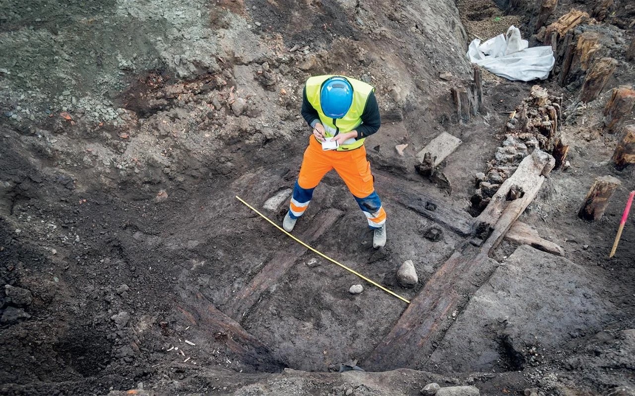 Najbardziej spektakularnym znaleziskiem okazał się kompletny system fortyfikacji miejskich. Archeolodzy odsłonili wał obronny, fosę oraz południową bramę prowadzącą do miasta. To właśnie przez tę bramę wjeżdżało się na główną arterię komunikacyjną Nya Lödöse – drogę biegnącą w kierunku północ-południe, która prowadziła prosto do rzeki Säveån. Wewnątrz umocnień badacze zidentyfikowali szereg zabudowanych działek rozciągających się wzdłuż głównego traktu. Ten układ urbanistyczny był charakterystyczny dla tamtego okresu, kiedy najważniejsze budynki mieszkalne i gospodarcze skupiały się przy głównych szlakach komunikacyjnych. Co ciekawe, znaczną część terenu wewnątrz murów zajmowały grunty uprawne, co świadczy o tym, że mieszkańcy prowadzili intensywną działalność rolniczą nawet w obrębie fortyfikacji.