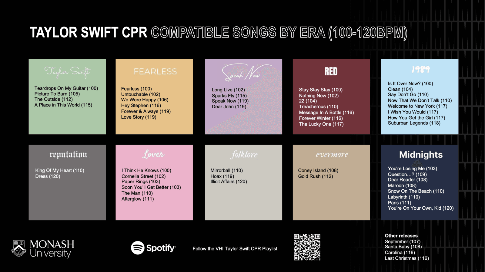 Zespół naukowców z Victorian Heart Institute na Monash University zidentyfikował ponad 50 piosenek Taylor Swift z rytmem idealnym do skutecznej resuscytacji krążeniowo-oddechowej (RKO). To oznacza, że młodzi fani i fanki Taylor Swift mogą przy jej hitach doskonalić umiejętności ratowania poszkodowanego, u którego wystąpiło nagłe zatrzymanie krążenia.
