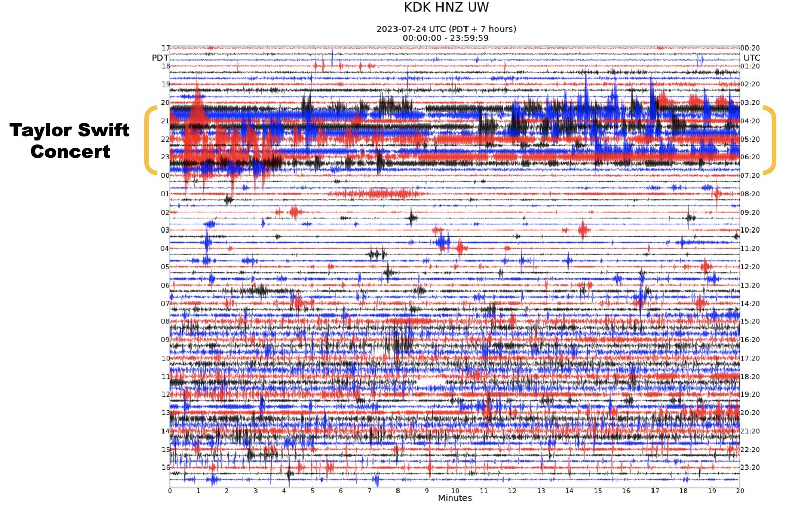 Trzęsienie ziemi miało miejsce 22 i 23 lipca, w sobotę i niedzielę wieczorem, podczas koncertu piosenkarki. Wstrząsy o sile 2,3 wychwyciła aparatura pomiarowa umieszczona niedaleko stadionu Lumen Field, gdzie odbywało się wydarzenie. Na wykresach z łatwością można dostrzec, że w godzinach, kiedy Taylor Swift śpiewała swoje największe muzyczne hity, ziemia trzęsła się najbardziej.