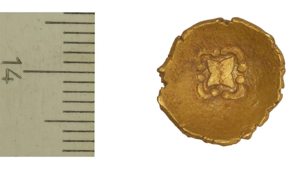 Wykonana ze złota moneta znajdowała się na brzegu rzeki Lech. Ma 13 milimetrów średnicy i waży niecałe 2 gramy