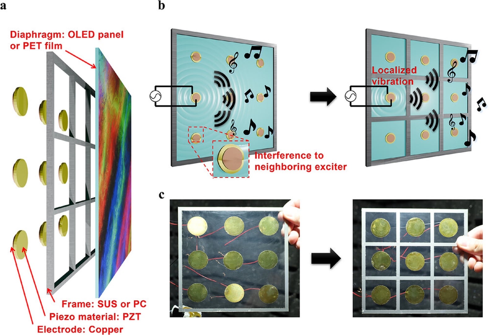 Naukowcy opracowali matrycę OLED połączoną z matrycą elementów piezoelektrycznych, zdolnych zamienić impulsy elektryczne w drgania o określonej częstotliwości. Wibracje są przekazywane na powierzchnię ekranu, co pozwala zamienić go w zespół głośników strefowych.