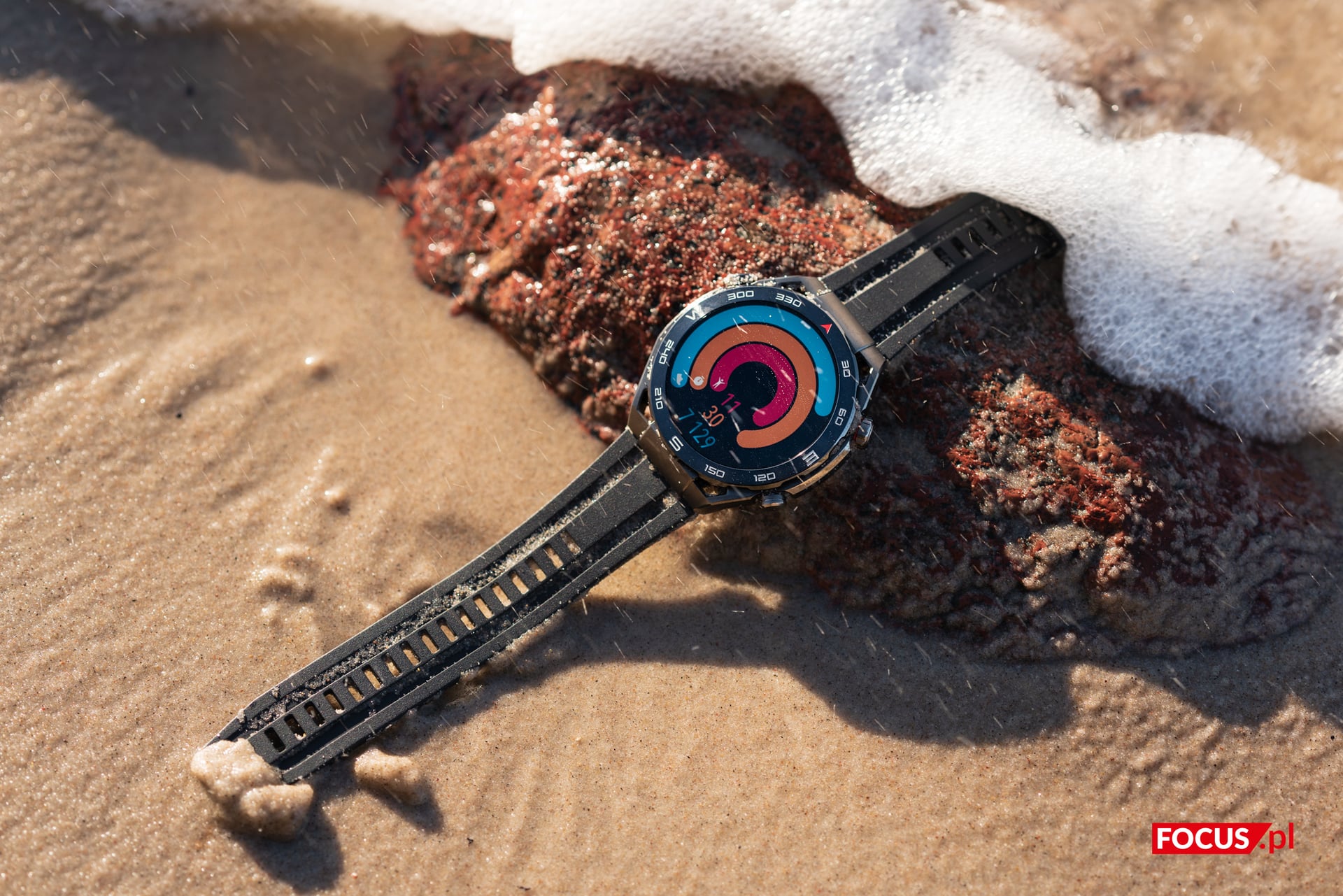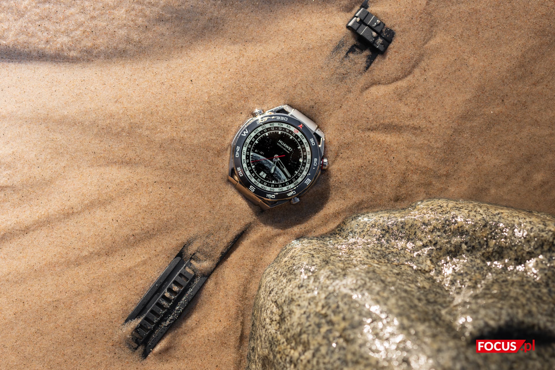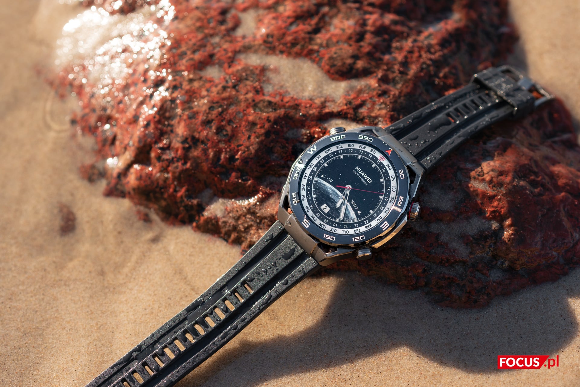 Korzystałem z Huawei Watch Ultimate w każdych warunkach, od kilkustopniowych mrozów i śniegu (w marcu, niech żyją zmiany klimatu), poprzez nadmorski piach i słoną wodę Bałtyku, aż po pracę w przydomowym ogródku. Niejeden raz zdarzyło mi się gdzieś niechcący “przytrzeć” obudową, a w czasie robienia zdjęć nad morzem zegarek stoczył się z kamieni prosto w mokry piach, gdzie momentalnie zalała go silna fala wody. Mimo to śladów zużycia nie stwierdzono.