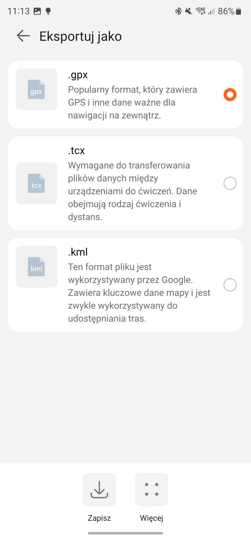Warto dodać, że Huawei Watch Ultimate pozwala wgrać do pamięci własną muzykę i podłączyć słuchawki Bluetooth, więc na trening możemy się udać bez telefonu. Szkoda tylko, że brakuje tu integracji z serwisami streamingowymi i jak wspominałem wcześniej, nie ma też map, które pozwoliłyby biegać bez telefonu po nieznanym terenie. Zapisaną trasę możemy za to wyeksportować w formatach .gpx, .tcx oraz .kml.