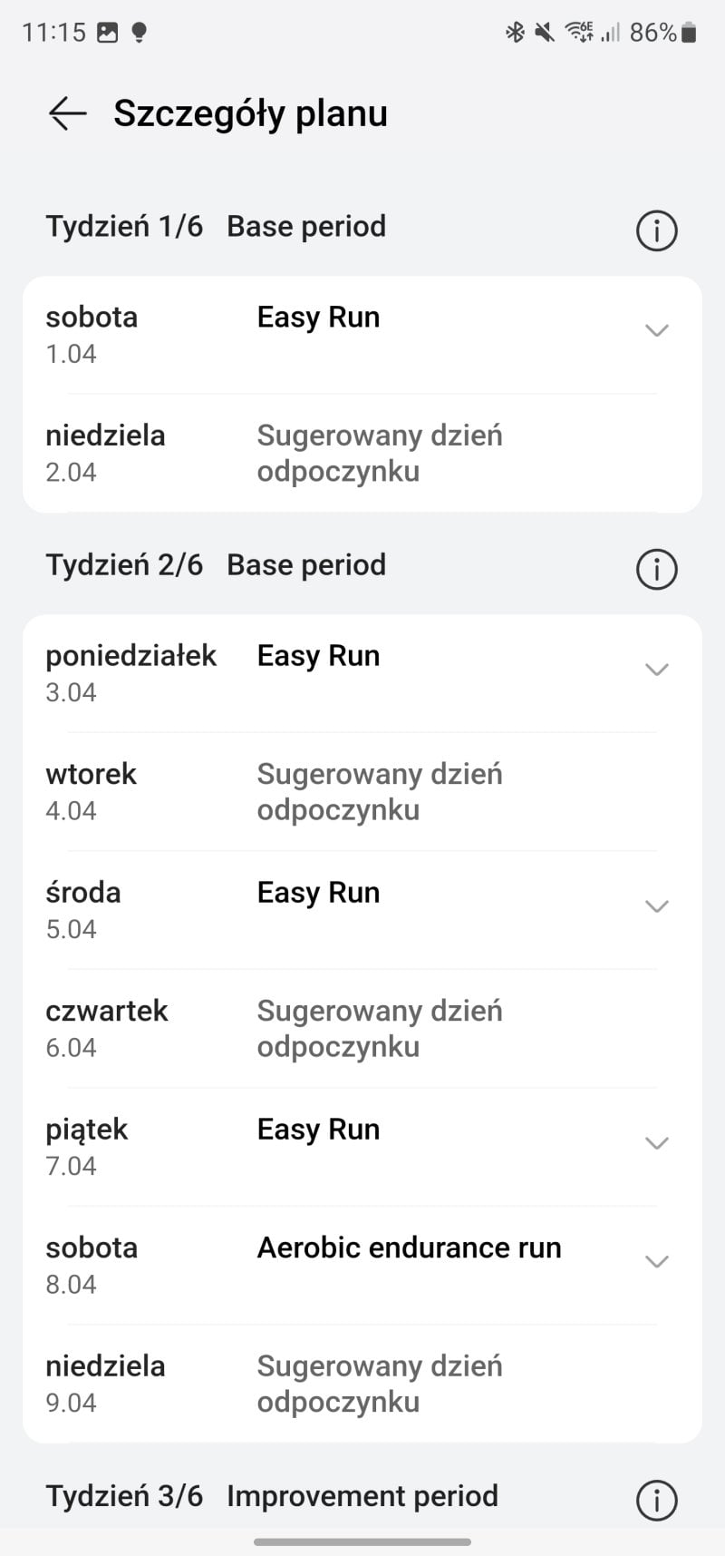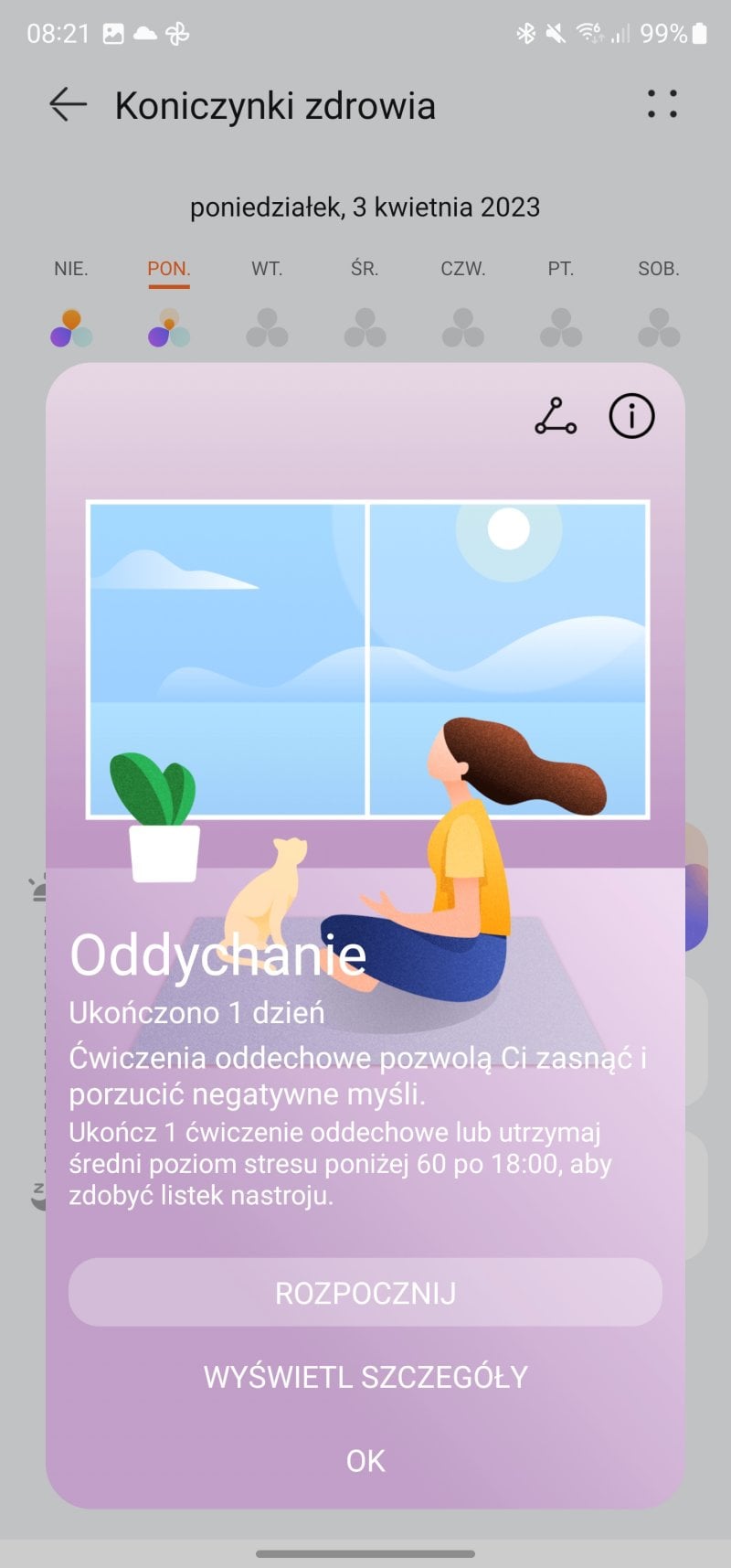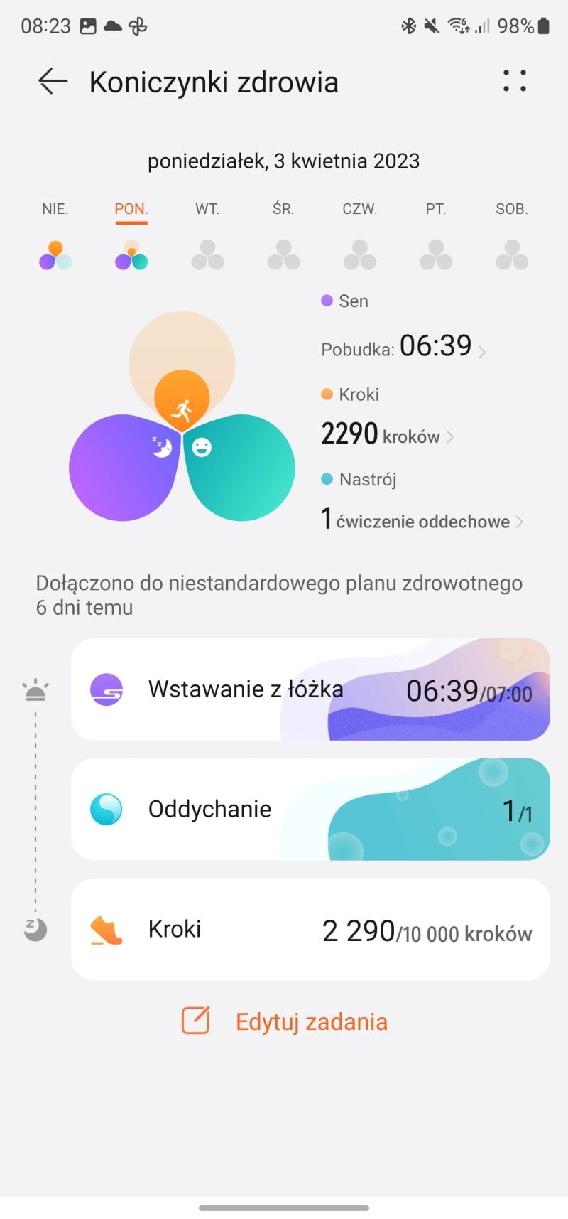 Bardzo podoba mi się też fakt, że oprócz “okręgów” mających na celu swoistą “gamifikację” zachowań prozdrowotnych, Huawei sugeruje też zbieranie “koniczynek zdrowia”. Nazwa może średnia, ale sens spory – każdego dnia możemy zebrać 3 listki, które wybieramy sobie z listy celów. Może być to nasz poziom stresu, czas snu i liczba kroków, ale mogą to też być inne cele, jak np. picie odpowiedniej ilości wody czy regularne wykonywanie badań.