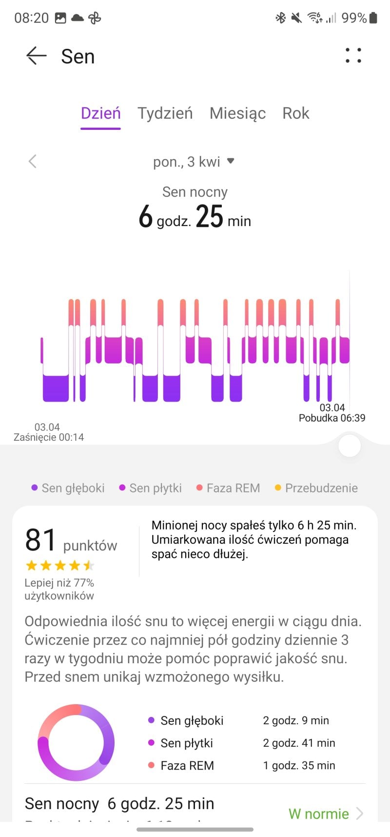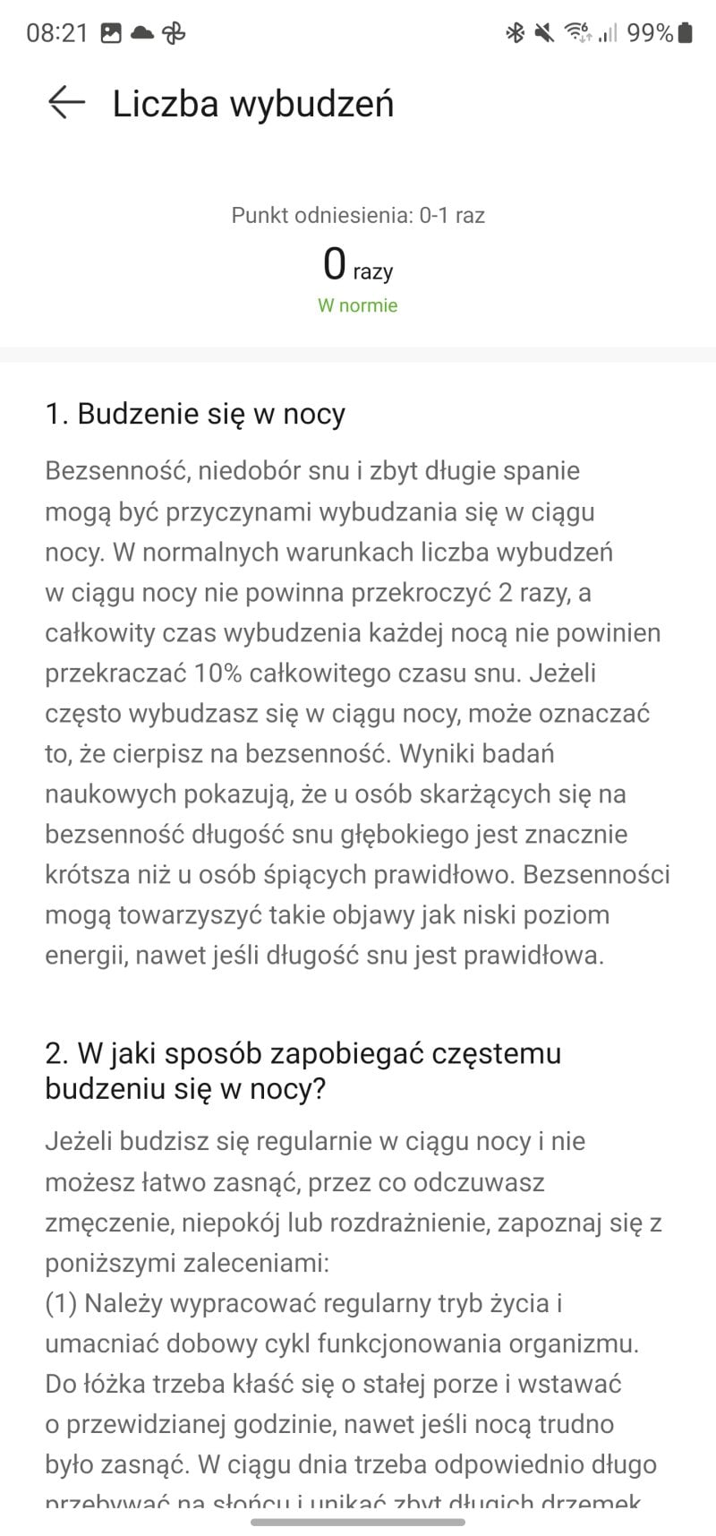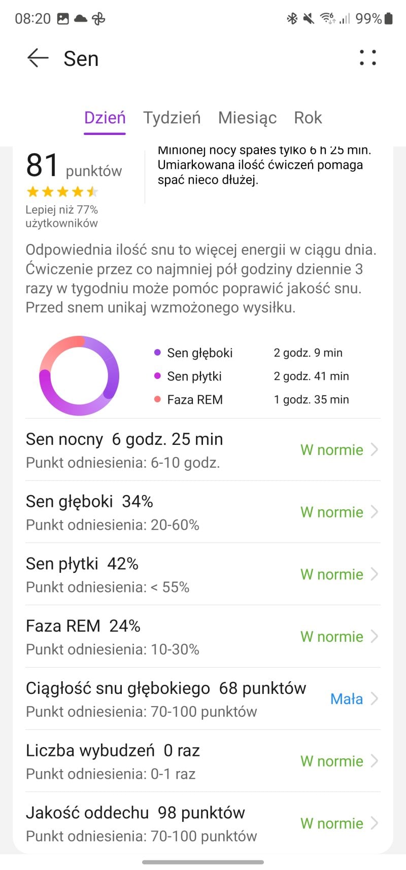 Ta jest niesamowicie dokładna, do tego stopnia, że zegarek potrafi rozpoznać nawet krótkie drzemki czy nocne pobudki. Algorytm TruSleep znakomicie zaś analizuje zebrane dane i co niemniej istotne, aplikacja Huawei Zdrowie serwuje nam bardzo rozbudowane wyjaśnienie każdego zagadnienia. Bo co nam po zebraniu tony danych, skoro nie będziemy wiedzieli, jak je interpretować? W przypadku Huaweia każdy zapis możemy dokładnie przeanalizować, a aplikacja sama podsuwa nam potencjalne problemy i wnioski. Dla osób mających problemy ze snem jest to funkcja nie do przecenienia i tutaj muszę podkreślić, że działa ona jeszcze lepiej niż monitoring snu w moim Garminie czy w Apple Watchu.