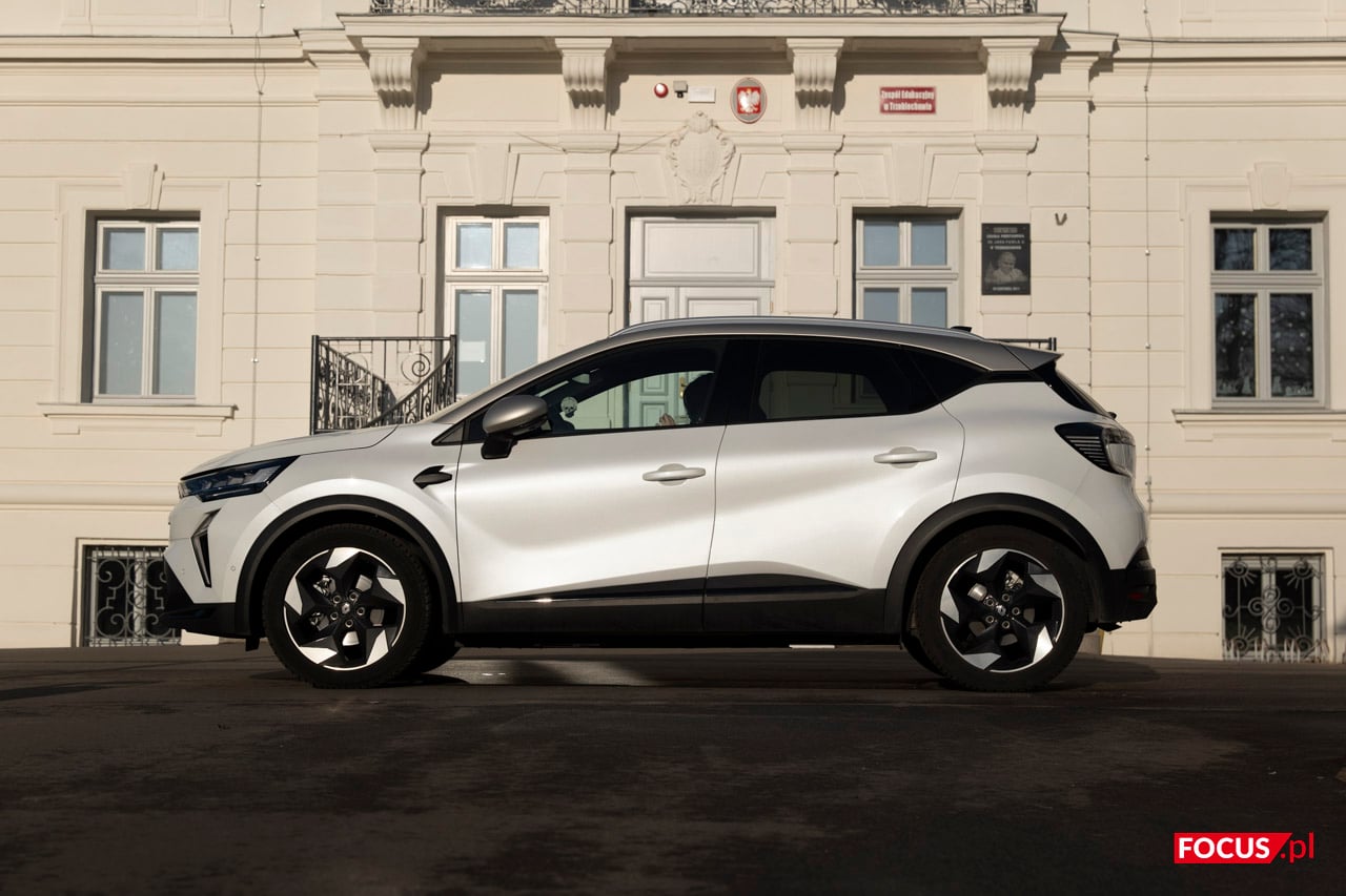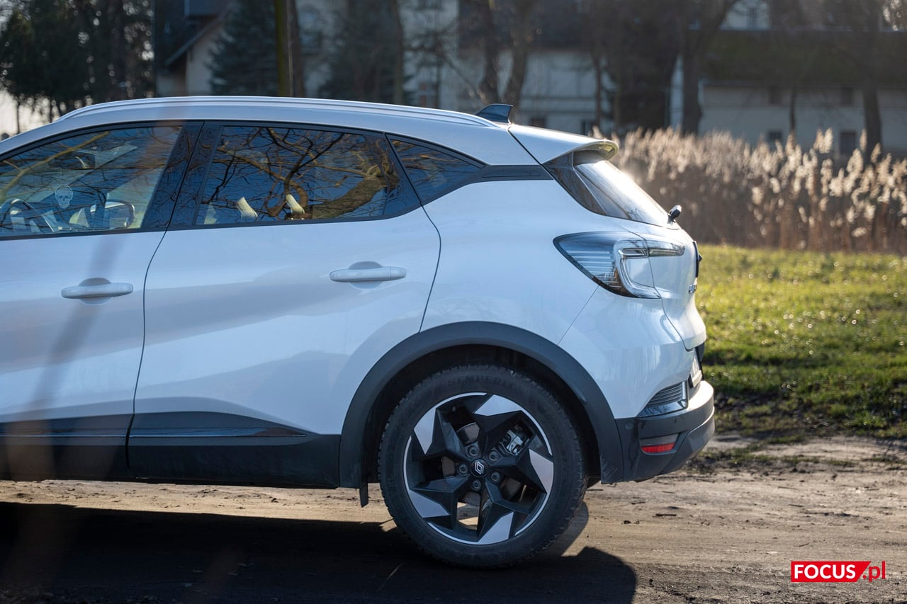 Testowany model to wersja Techno z napędem E-Tech full hybrid 145 z 18-calowymi aluminiowymi felgami w kolorze Techno Black. Te są proporcjonalne do rozmiarów konstrukcji i prześwitu, który wynosi 169 mm Wysiadanie z pojazdu nie wymaga nurkowania nogami, al. Sam kształt pojazdu pozostaje mimo tego nieco pudełkowaty. Renault Captur ma 4239 mm długości, 1797 mm szerokości i 1575 mm wysokości. Rozstaw osi to z kolei 2639 mm. W białej wersji te wymiary wydają się powiększone i faktycznie potrafi ona przyciągnąć wzrok. Grunt, że na miejscu parkingowym zmieścicie się bez problemu. Progi zabudowano plastikowymi elementami, co z jednej strony ma sens, a z drugiej nieco odbiera magii do tego miejsca dość eleganckiej konstrukcji.