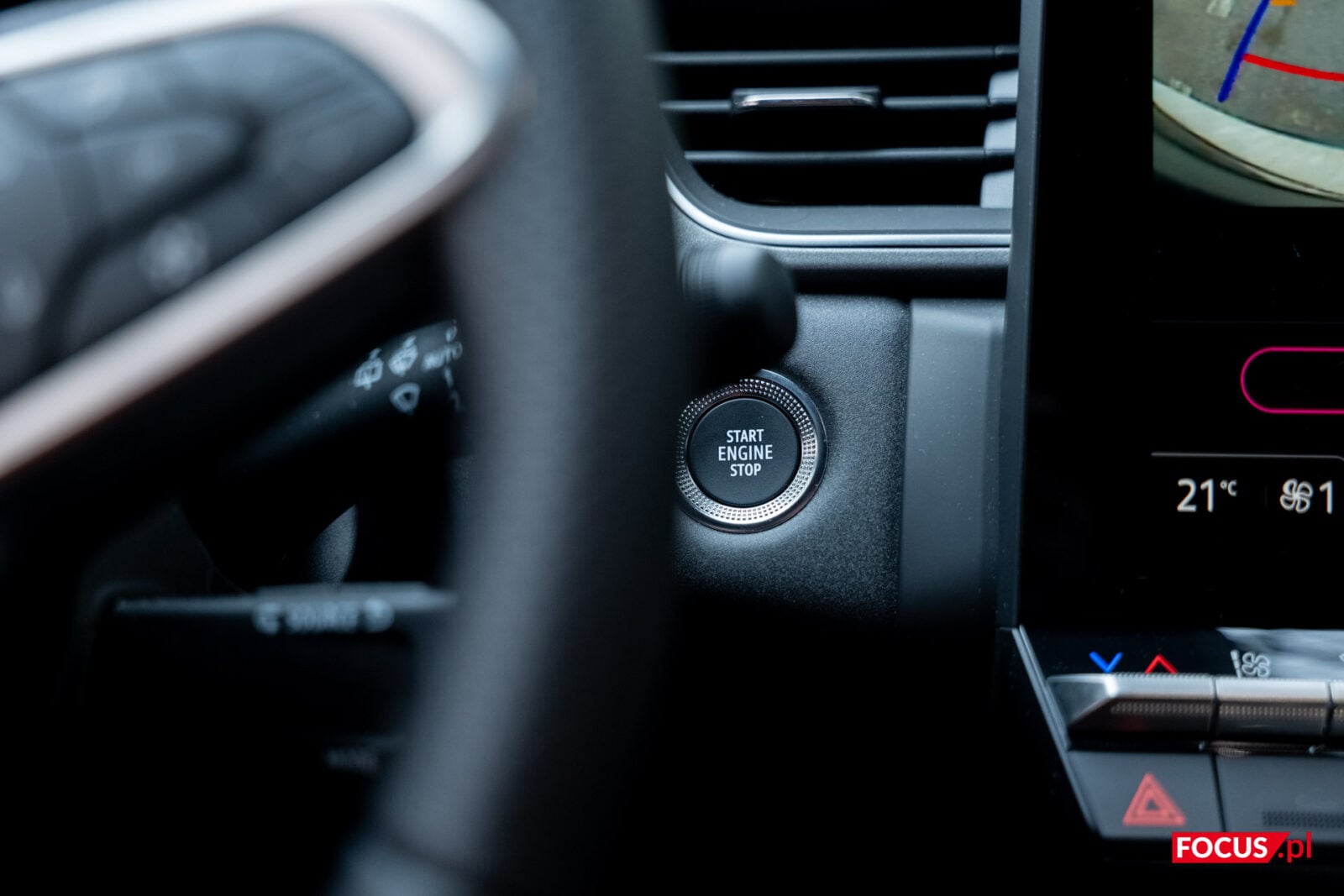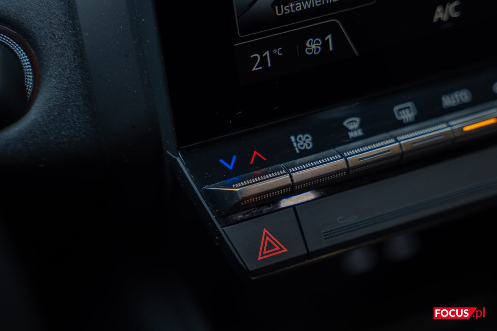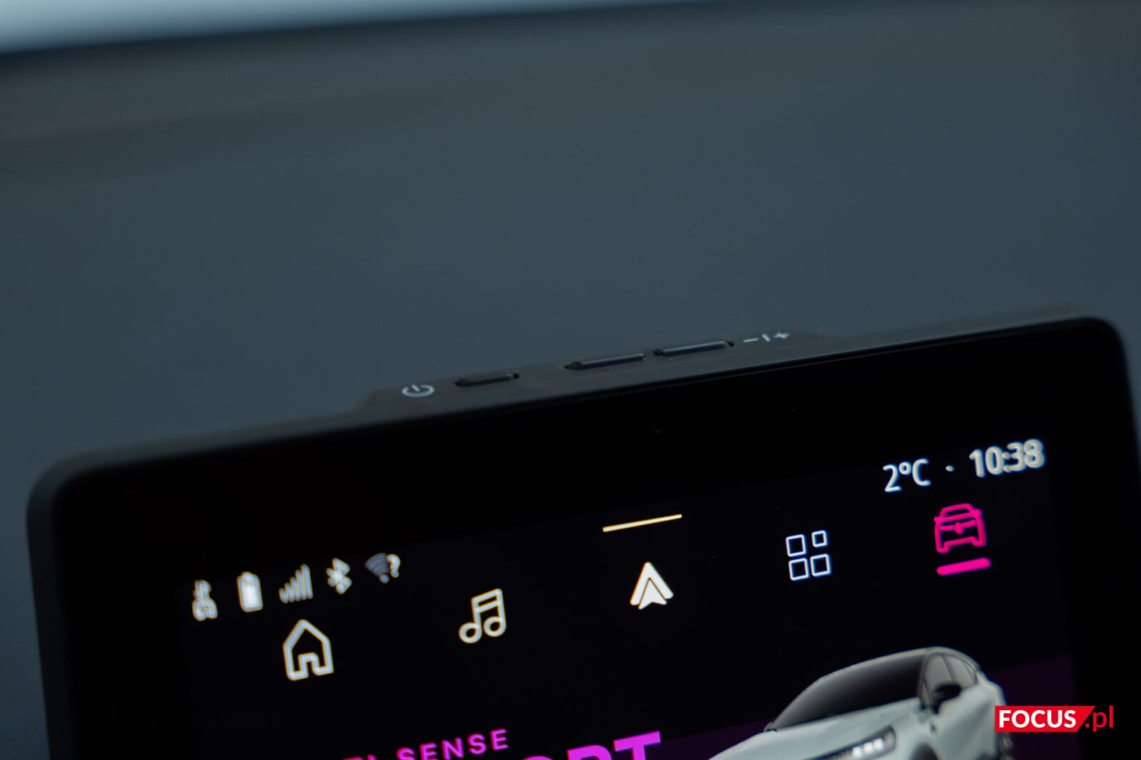 Przy ekranie zaimplementowano też fizyczne przyciski głośności oraz wyłącznik, które z jakiegoś powodu umieszczono na samej górze, a które są słabo widoczne i nie aż tak przyjemne przy kliknięciu. Pod ekranem zmieszczono za to fizyczne przyciski do kontrolowania temperatury i sposobu nagrzewania w aucie. Dobrze, że i tych nie pozbyto się na rzecz rozwiązań dotykowych, ale mogłyby być większe, a najlepiej gdyby znajdowały się na froncie – ramki dookoła ekranu i tak są dosyć spore.