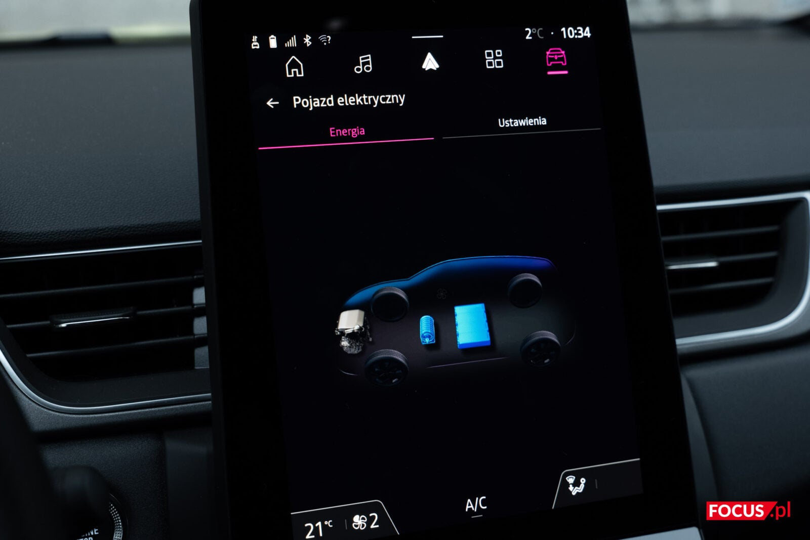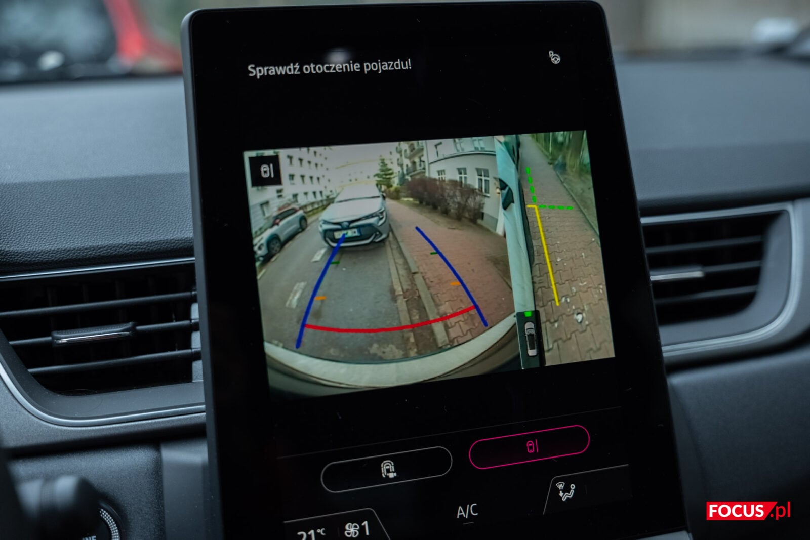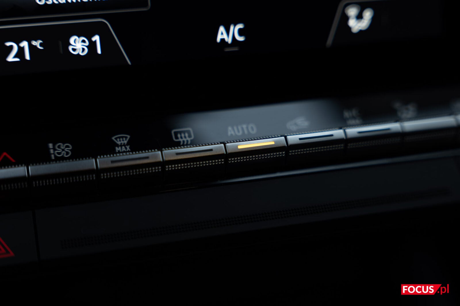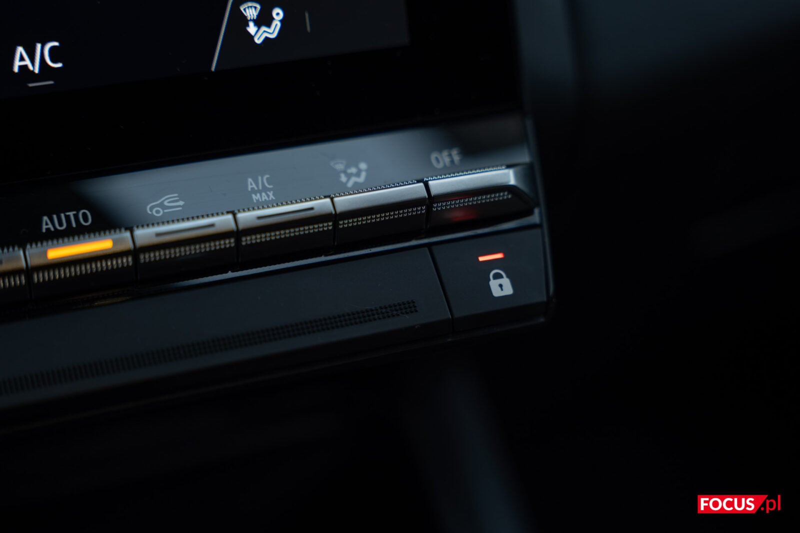 Przy ekranie zaimplementowano też fizyczne przyciski głośności oraz wyłącznik, które z jakiegoś powodu umieszczono na samej górze, a które są słabo widoczne i nie aż tak przyjemne przy kliknięciu. Pod ekranem zmieszczono za to fizyczne przyciski do kontrolowania temperatury i sposobu nagrzewania w aucie. Dobrze, że i tych nie pozbyto się na rzecz rozwiązań dotykowych, ale mogłyby być większe, a najlepiej gdyby znajdowały się na froncie – ramki dookoła ekranu i tak są dosyć spore.