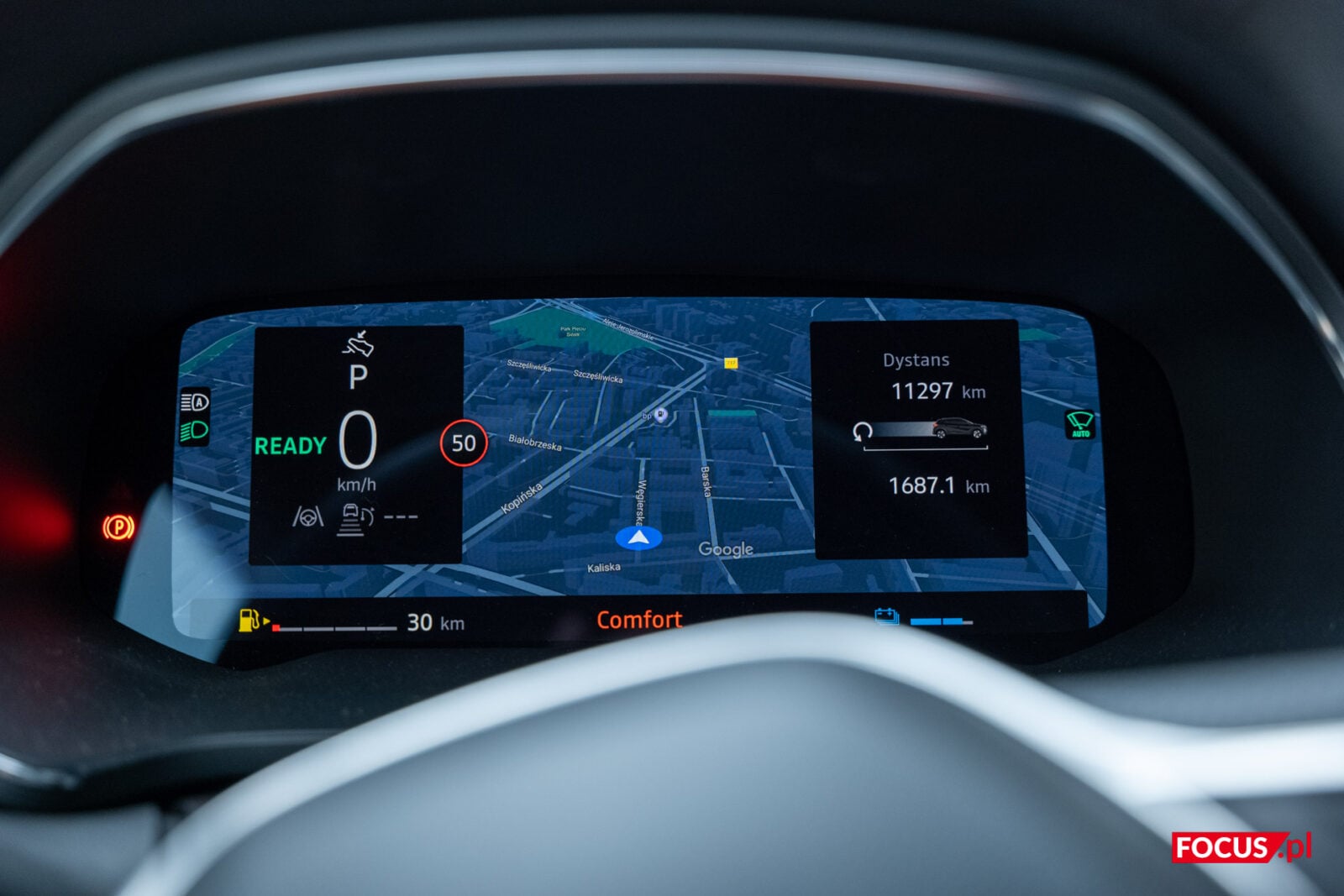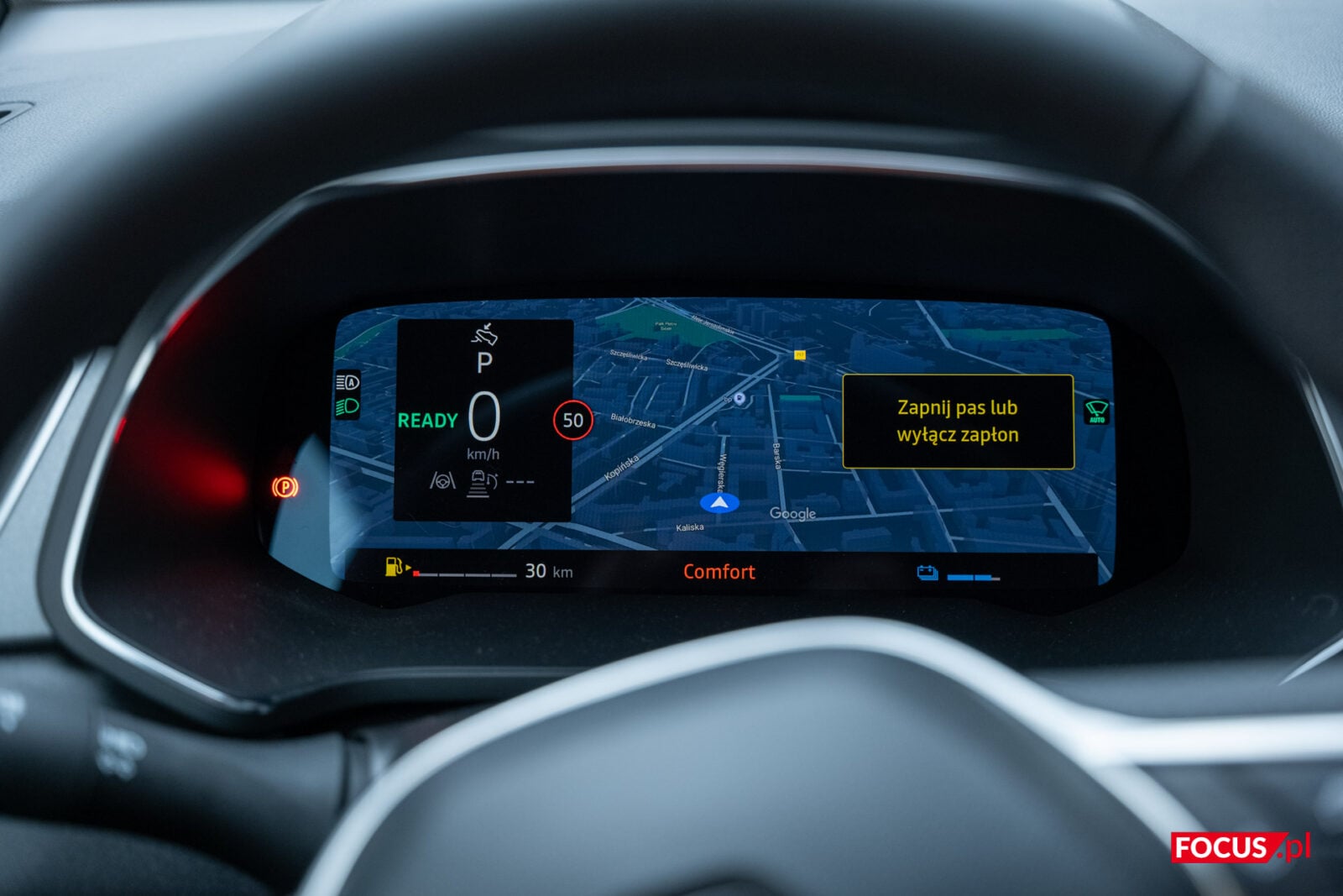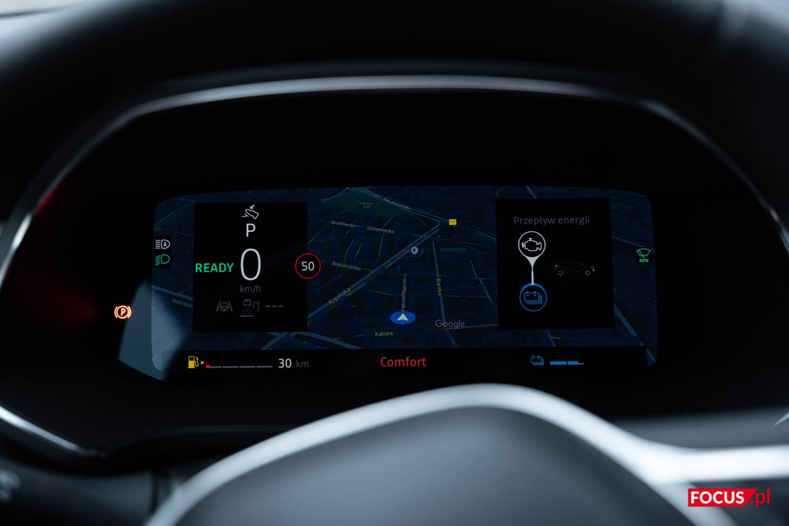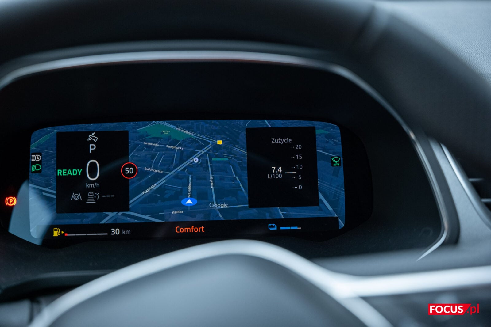 Co ważne i przydatne dla mnie, na ekranie kierowcy wyświetlimy nie tylko prędkość czy wskaźniki mierzące jazdę, ale także nawigację od Google. To całkowicie normalne, ale w praktyce nie wszyscy producenci potrafią na to sobie pozwolić. Z kolei duży ekran pozwoli na parkowanie i manewrowanie ze wsparciem systemu kamer 360 stopni. Ich jakość pozostawia wiele do życzenia, a zimą niemal na pewno będą one zabrudzone, ale ostatecznie wykonują swoje zadanie.