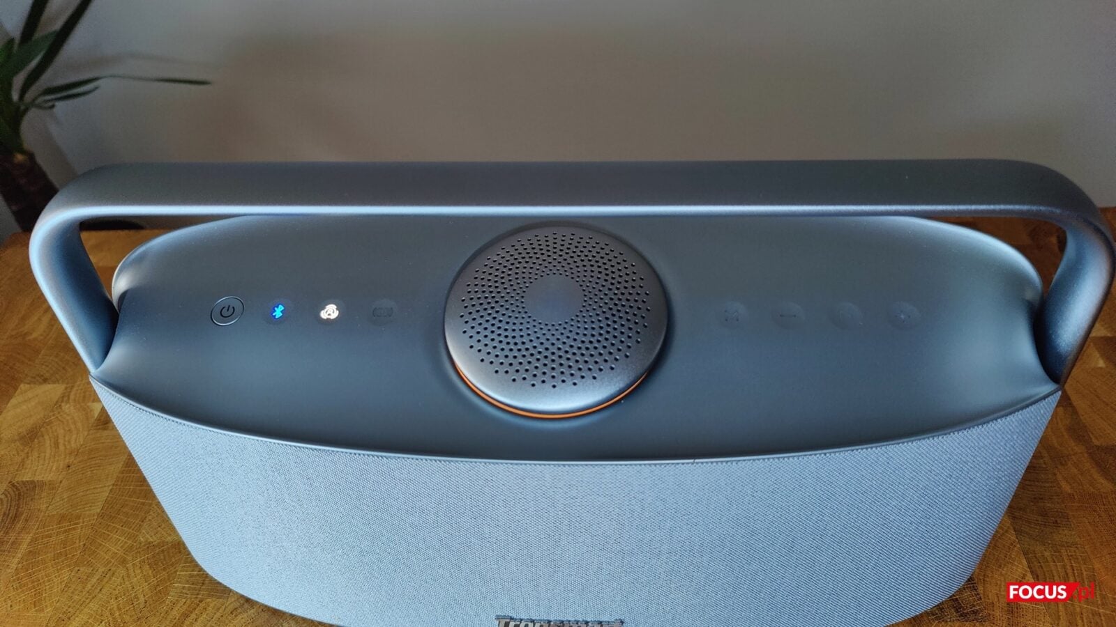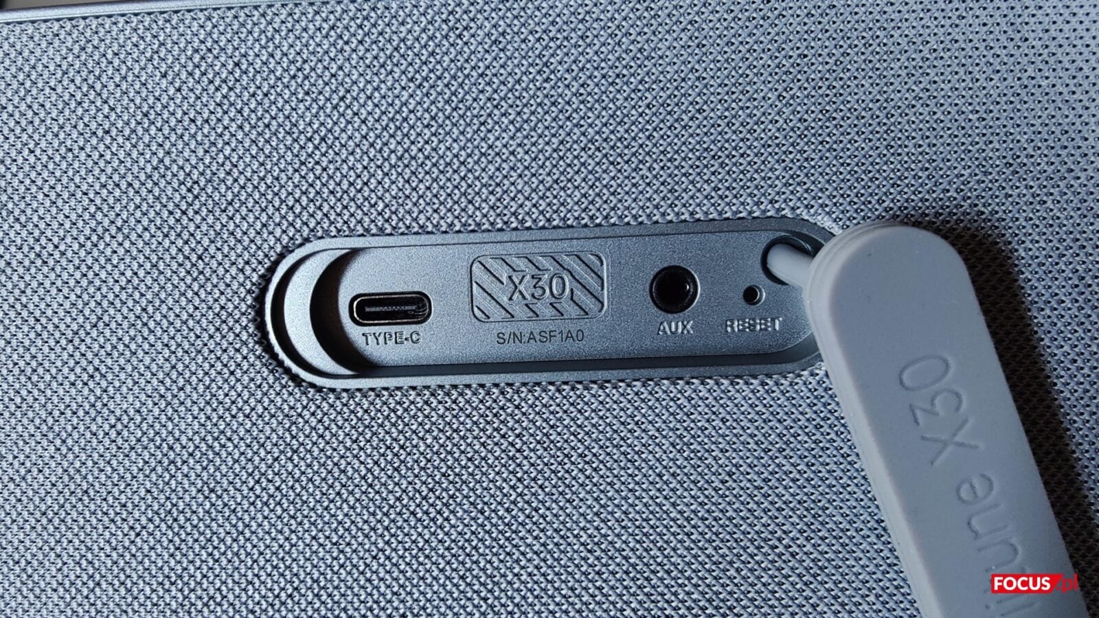 Nowocześnie prezentująca się obudowa Fiitune X30 została wykonana z tworzywa sztucznego, które dzięki matowemu wykończeniu przypomina aluminium. Producent pokrył zaoblony tył i front materiałem tekstylnym o drobnym splocie, a u góry zastosował całkowicie zintegrowany, sztywny uchwyt. Takie podejście do projektu zrobiłoby z modelu ot kolejny minimalistyczny głośnik do pary z meblami Ikea, ale jego design został wyróżniony przez okrągły, osłonięty górny przetwornik, którego to otoczenie zostało urozmaicone podświetlanym we wszystkich kolorach pierścieniem. Na spodzie Tronsmart umieścił z kolei grube podkładki antypoślizgowe, a z tyłu pod gumową zaślepką zarówno port USB-C do ładowania, jak i wejście AUX.