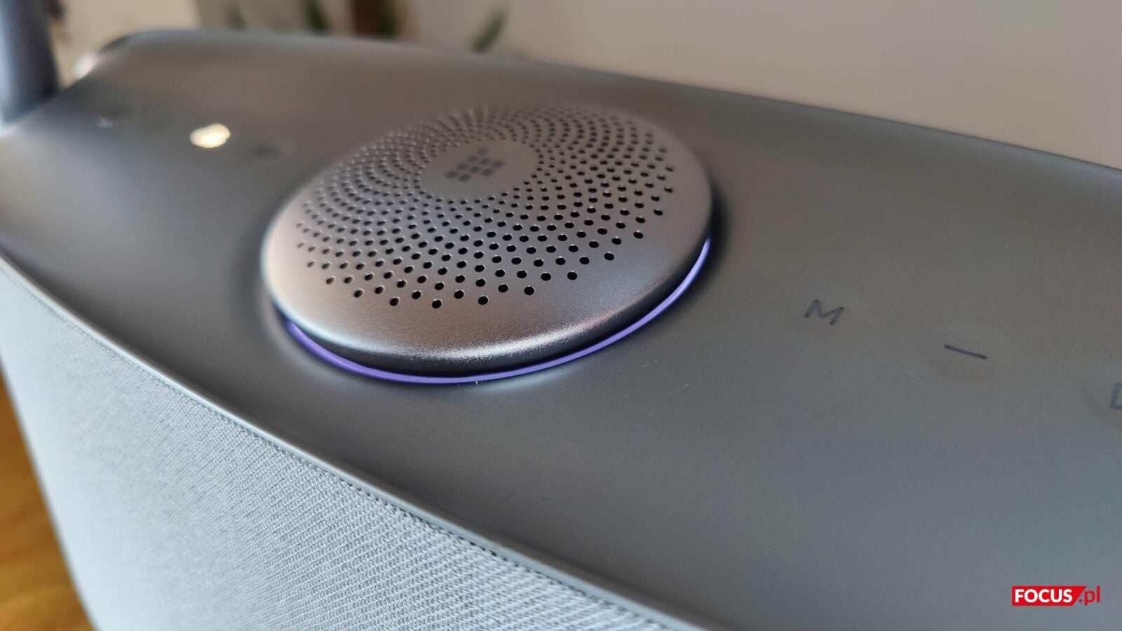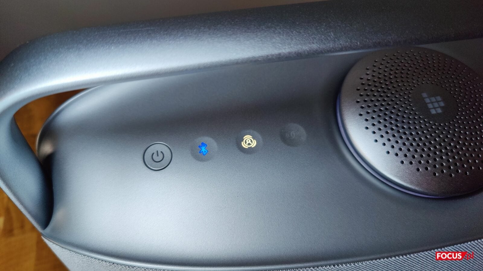 Panel sterowania został z kolei umieszczony na górnej powierzchni. Składa się z ośmiu podświetlanych przycisków z czego siedem jest dotykowych, a jeden fizyczny i jest to sensownie akurat ten, który to odpowiada za wyłączanie i włączanie sprzętu. Poza nim na górnej części znalazły się też przyciski do regulacji głośności, sterowania odtwarzaniem, przełączania trybów pracy, aktywowania Bluetooth, a także dedykowany przycisk do trybu przestrzennego (Spatial Sound) oraz parowania dwóch głośników w układzie stereo.