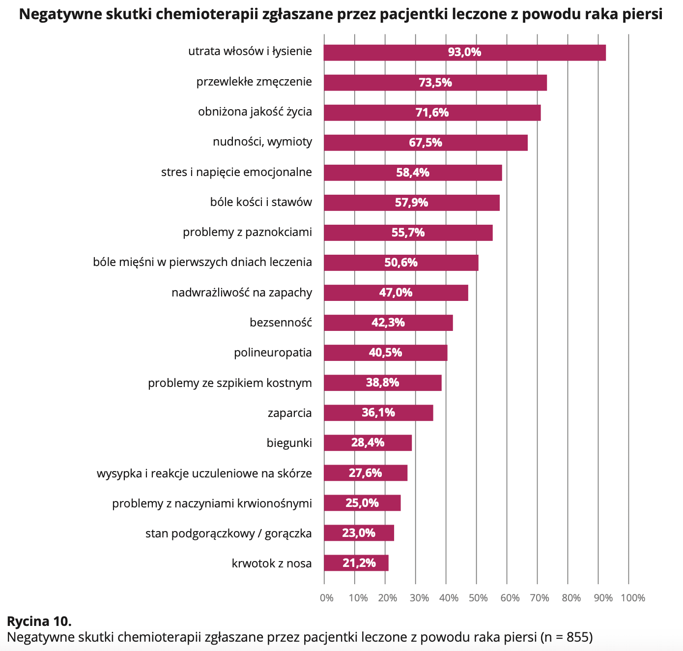 Z raportu wynika, że spośród 1295 respondentek aż 73 proc. było leczonych chemioterapią, a ponad 90 proc. z nich zgłaszało działania niepożądane, takie jak utrata włosów (93 proc.), przewlekłe zmęczenie (73,5 proc.), obniżenie jakości życia (71,6 proc.) czy stres emocjonalny (58,4 proc.). W grupie pacjentek z rakiem piersi typu HR+/HER2-, czyli tej, która mogłaby najbardziej skorzystać na zastosowaniu testów wielogenowych, chemioterapia została zastosowana aż u 62,3 proc. kobiet, mimo że badania wskazują, iż tylko część z nich realnie odnosi z niej korzyść.