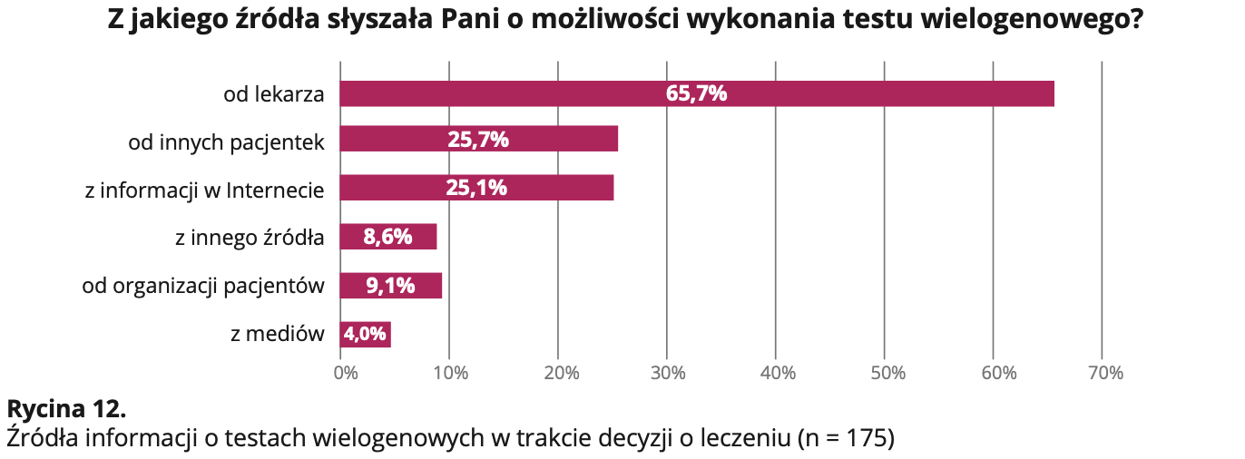 Jak pokazują dane, 78 proc. pacjentek uważa, że decyzja terapeutyczna oparta na wyniku testu wielogenowego zwiększyłaby ich zaufanie i akceptację wobec leczenia, co oznacza, że wprowadzenie tej diagnostyki nie tylko poprawiłoby trafność terapii, ale też zmniejszyło lęk i stres towarzyszące leczeniu onkologicznemu. Co istotne, obecnie dominującym źródłem informacji o testach są inni pacjenci i Internet – tylko 65 proc. kobiet, które znały testy, dowiedziało się o nich od lekarza. To wskazuje na lukę komunikacyjną i brak systemowego wdrożenia diagnostyki genetycznej do procesu leczenia.