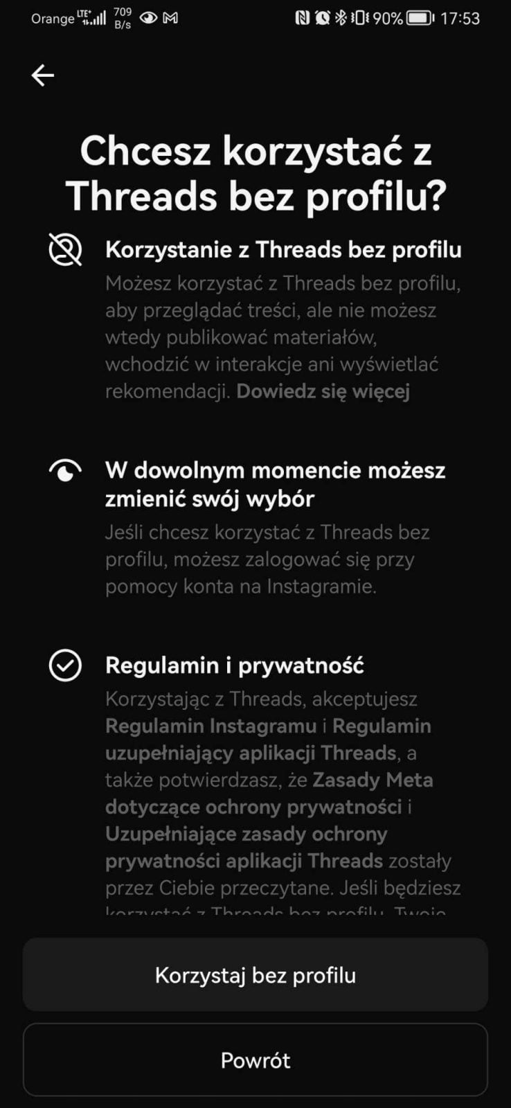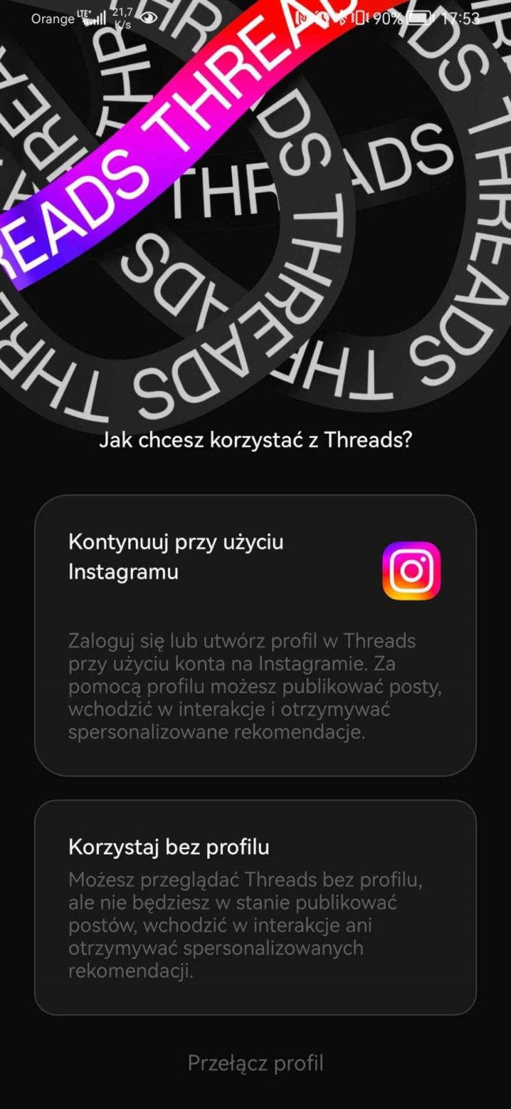 Mark Zuckerberg ogłosił dziś, że Threads są już dostępne w Europie, w Polsce też już możemy aplikację pobrać, a więc udało się dostosować do wszystkich wytycznych stawianych przez UE. Co najważniejsze, nasza wersja różni się trochę od tej, z której korzystają użytkownicy w USA. U nas pojawiła się możliwość korzystania z serwisu bez zakładania konta. Oczywiście opcja logowania jest, w tym przez Instagrama. Na szczęście w każdej chwili oba konta można odłączyć – jednak na wstępie dostajemy tylko dwie opcje.